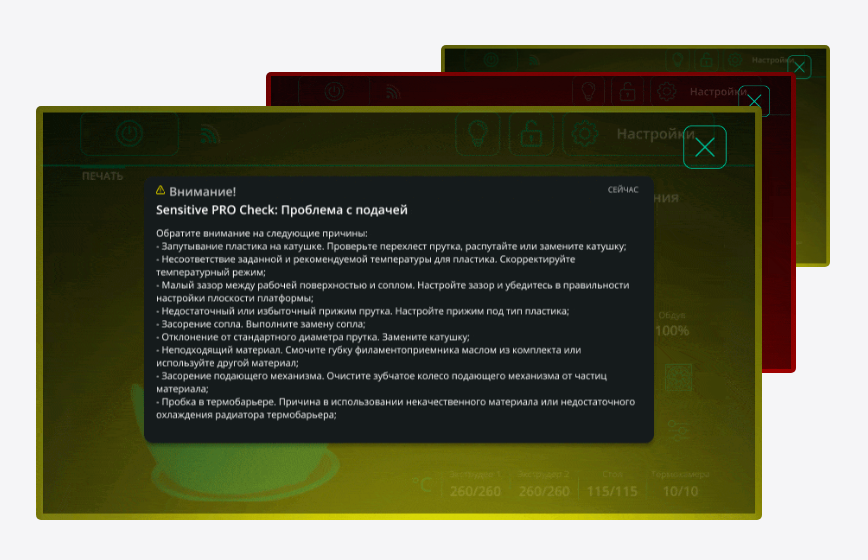 Умная система Solid Print Pro Check создана, чтобы предотвратить продолжение печати, если деталь исказилась или отклеилась в процессе. Такое бывает, если плохо нанесён клей или неверно подобраны настройки печати. Но Hercules защитит вас от потери времени и пластика, остановит печать и уведомит пользователя при помощи уведомления Smart Notification System на экране.
