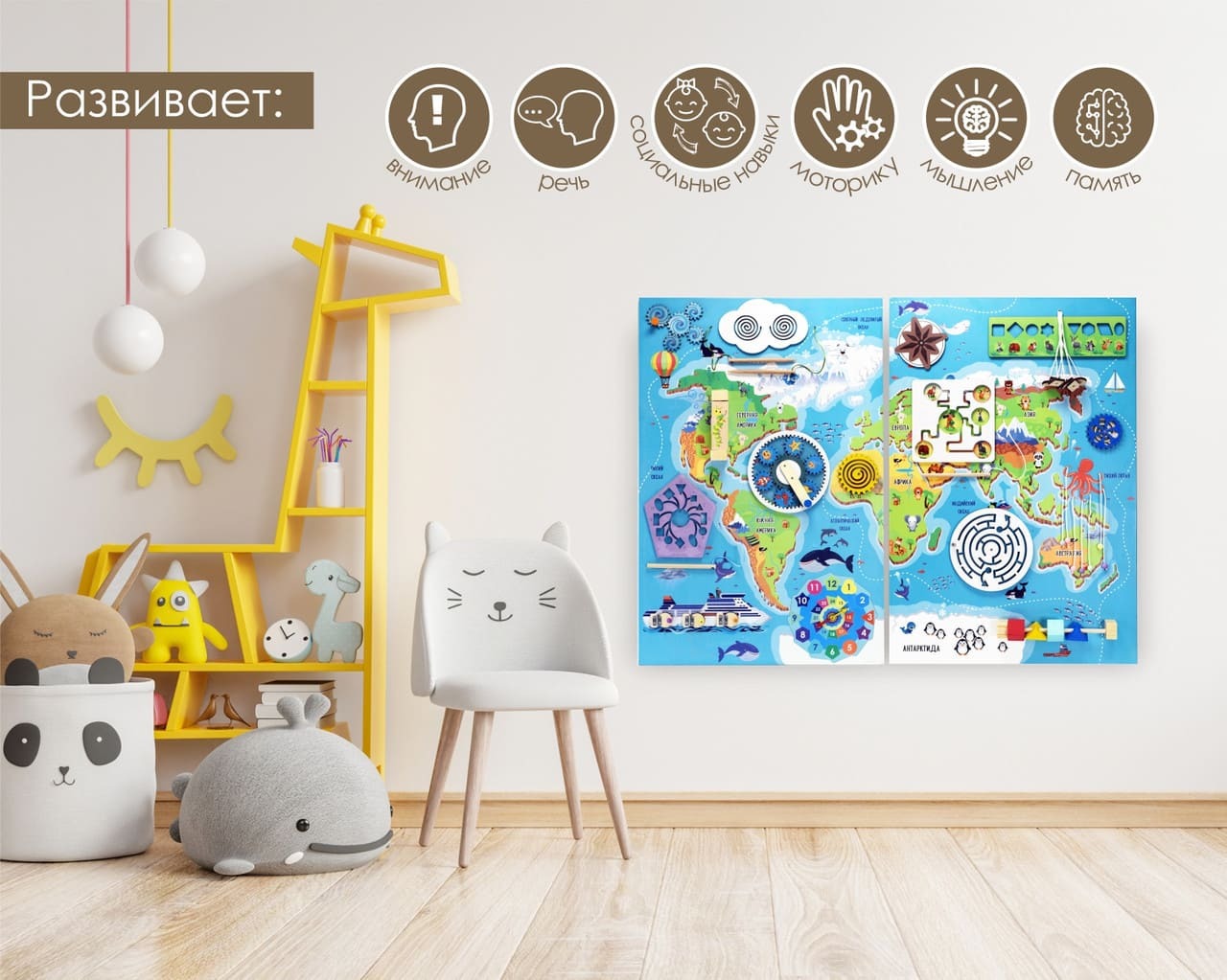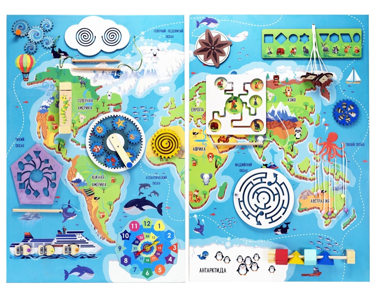 Бизиборд "Материки и океаны" поможет сформировать у детей общие представления о нашей планете, материках и океанах; расширит представления детей о нашей планете; познакомит с названиями океанов и материков.