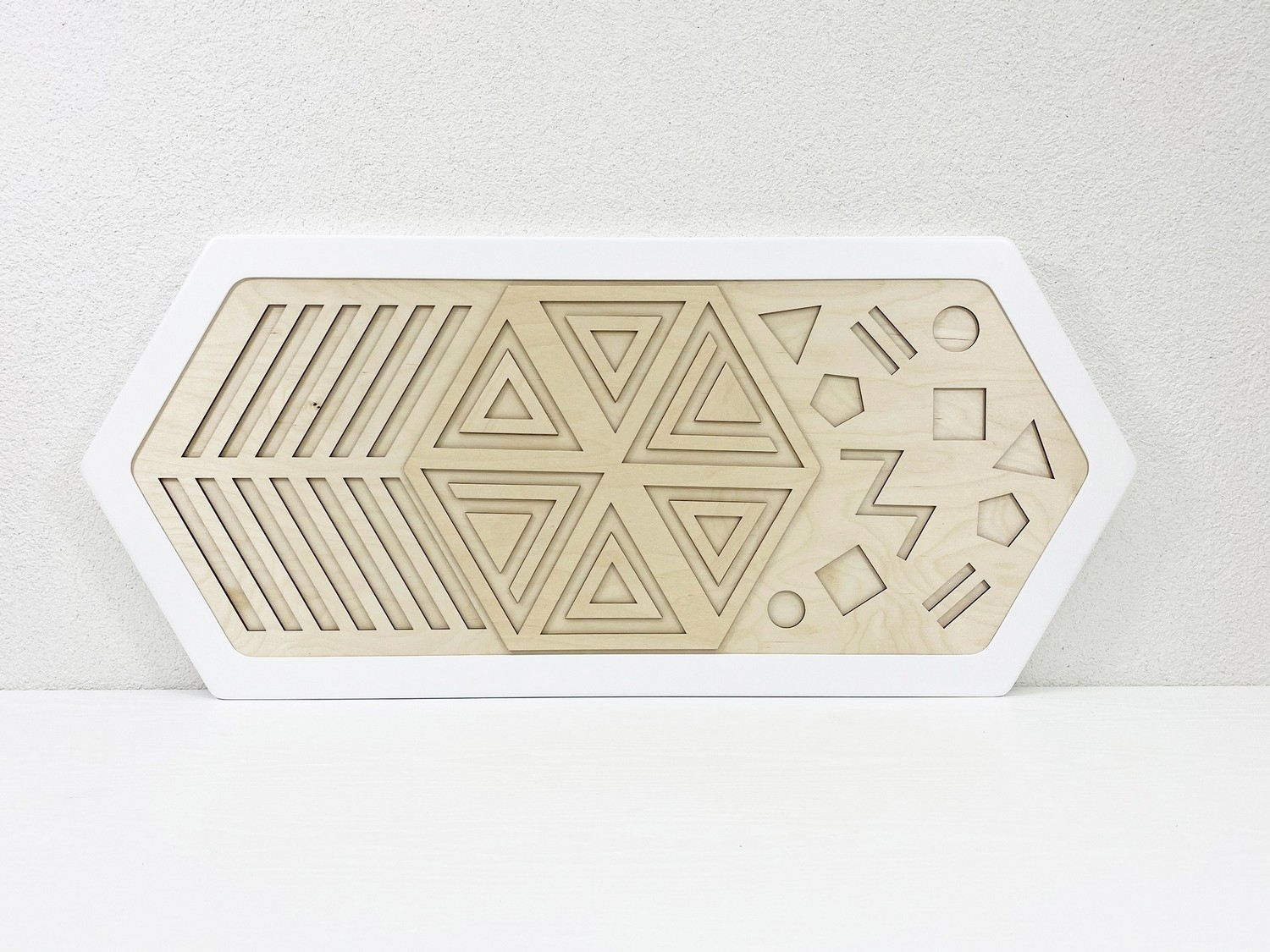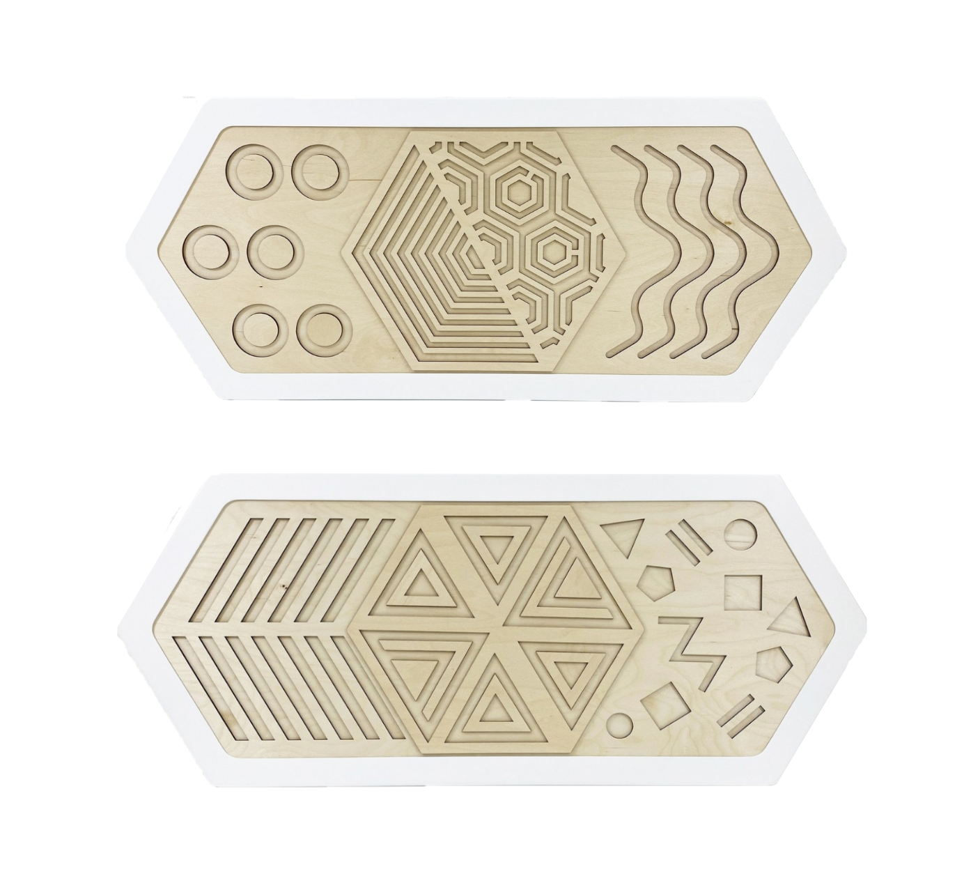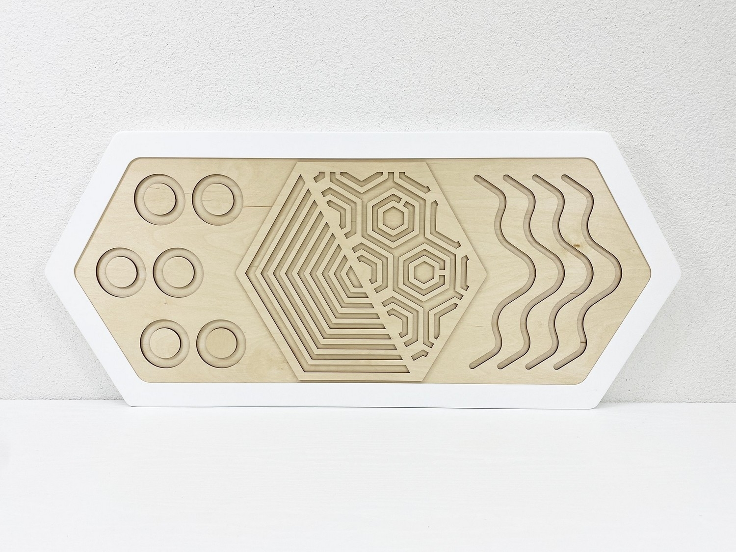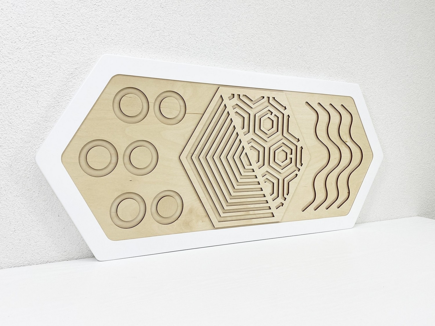 Тактильные элементы на панелях выполнены из дерева. Они учат ребёнка различать и сравнивать между собой свойства предметов: текстуру и формы. Подходят как для обустройства сенсорных комнат, так и для оформления групп, коридоров и холлов в детских учреждениях.