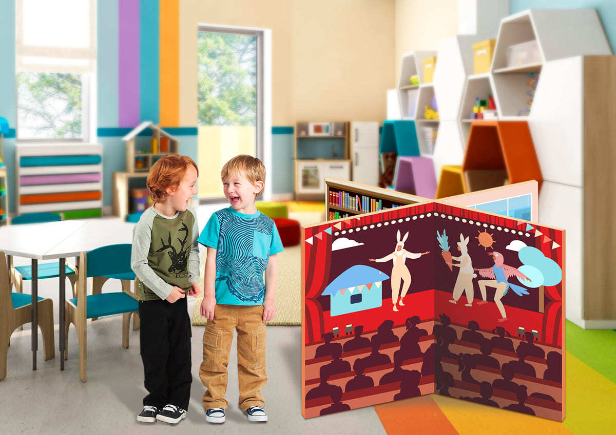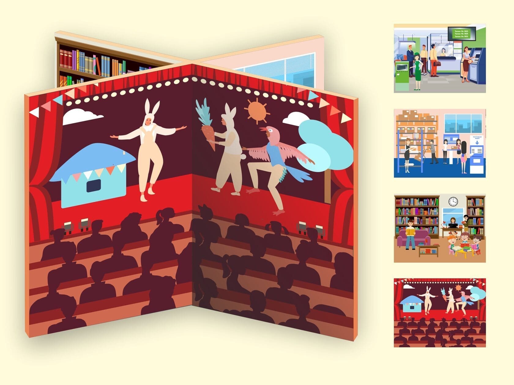 Ширмы-книги способствуют созданию тематического пространства ОБЩЕСТВЕННЫХ УЧРЕЖДЕНИЙ, а именно: БАНК, ПОЧТА, БИБЛИОТЕКА, ТЕАТР.