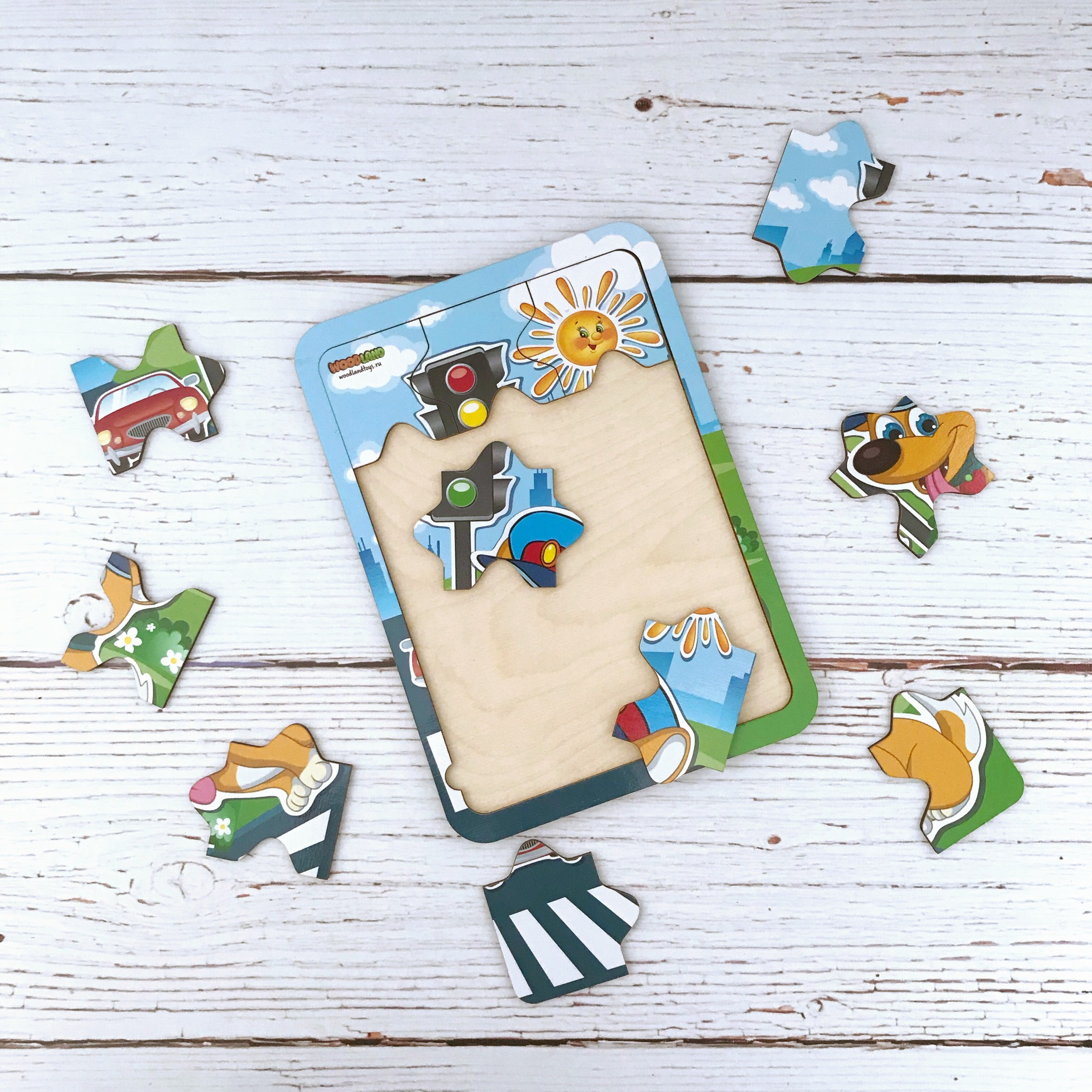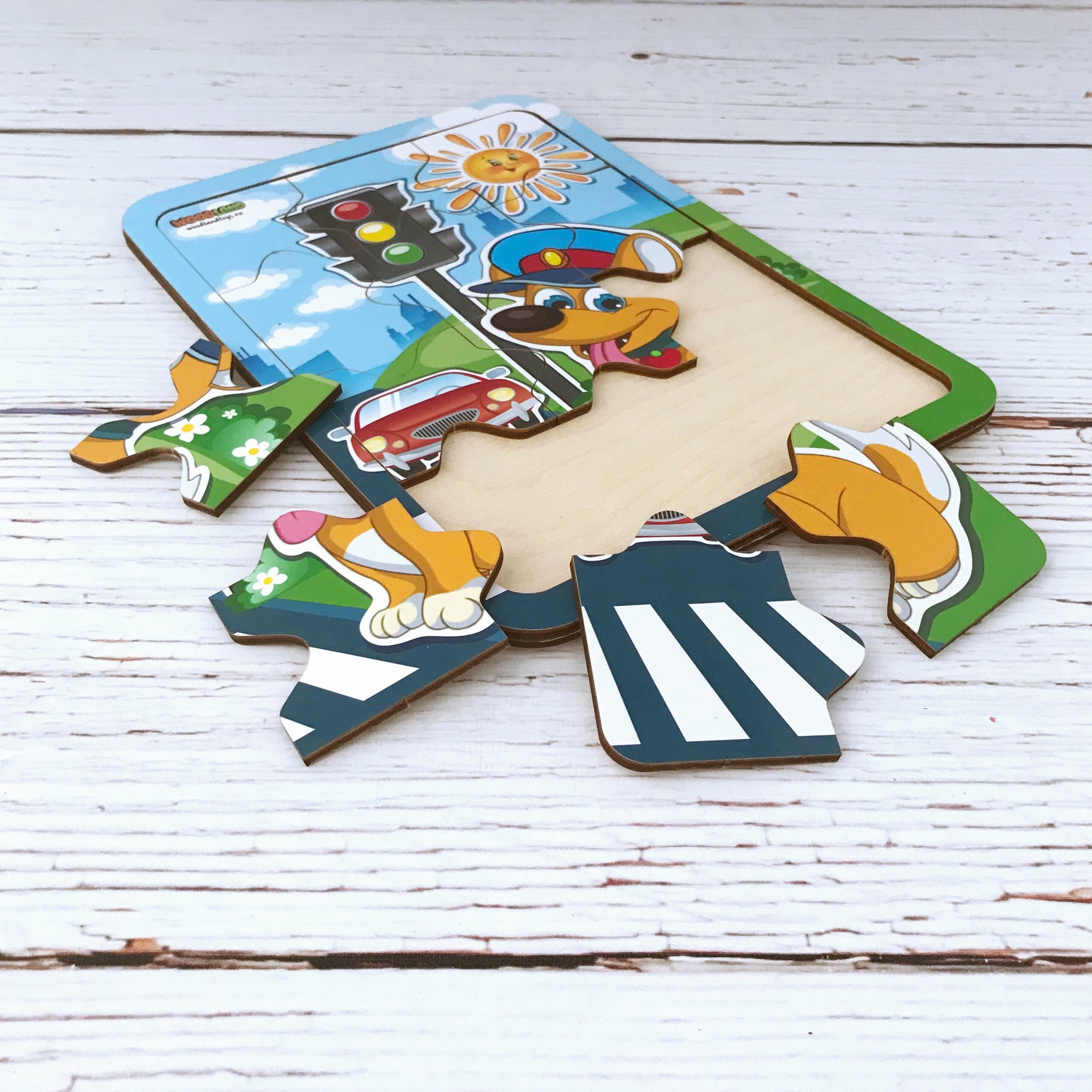 В процессе игры с пазлами «Собачка-постовой» у ребенка развивается внимательность, логическое и аналитическое мышление, способность концентрировать внимание на поиск нужных мелких деталей.