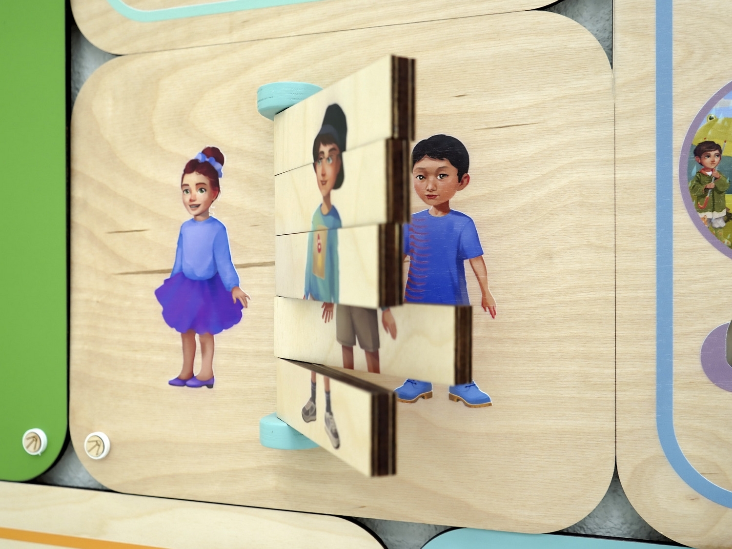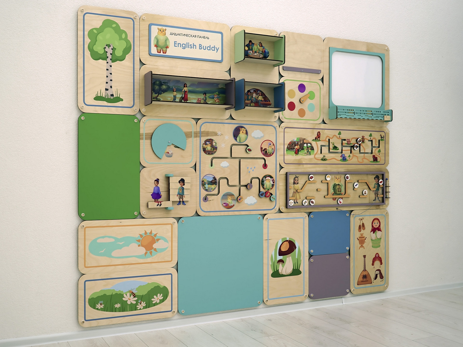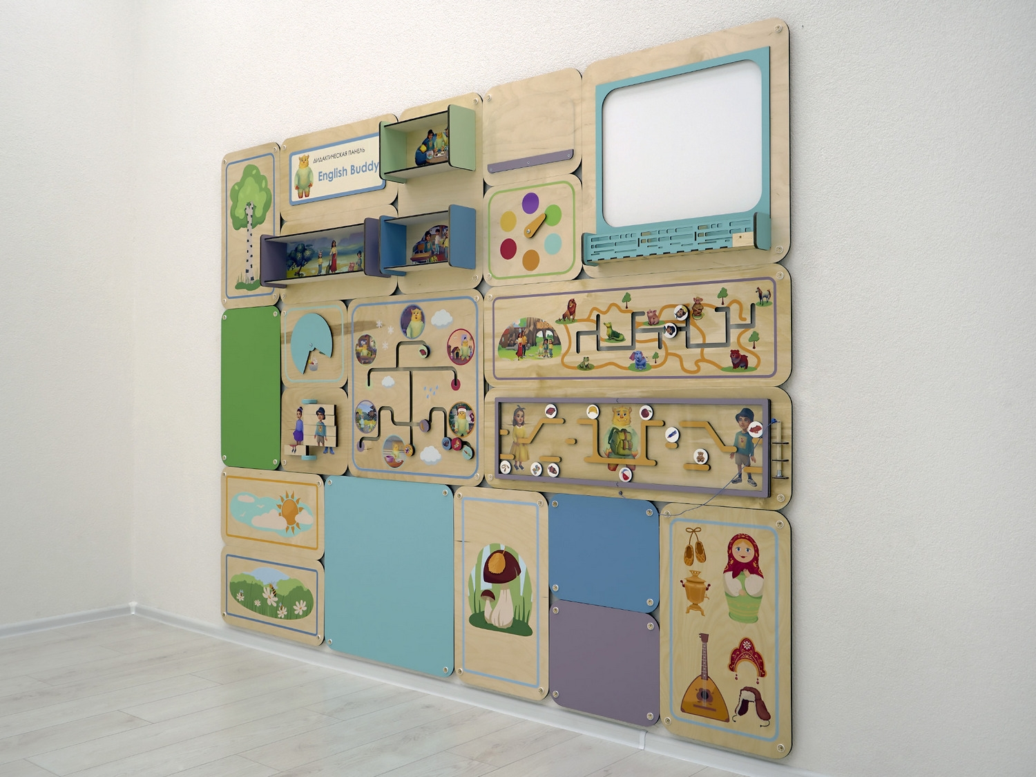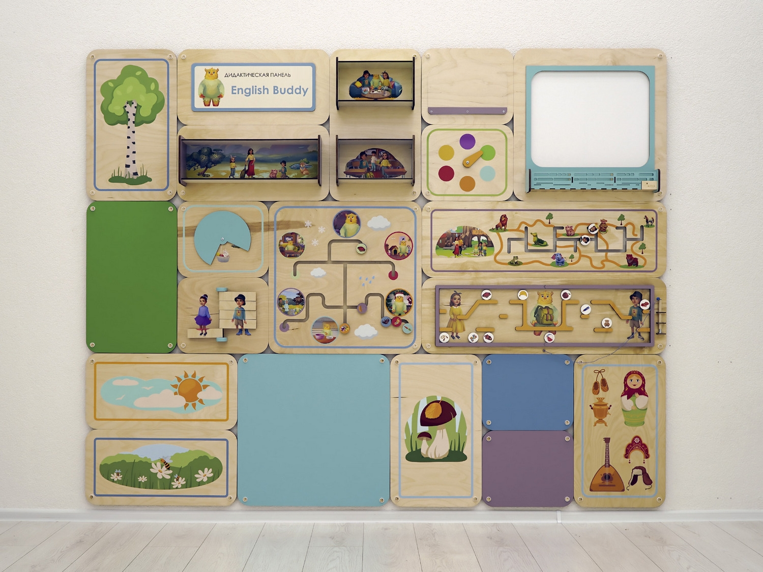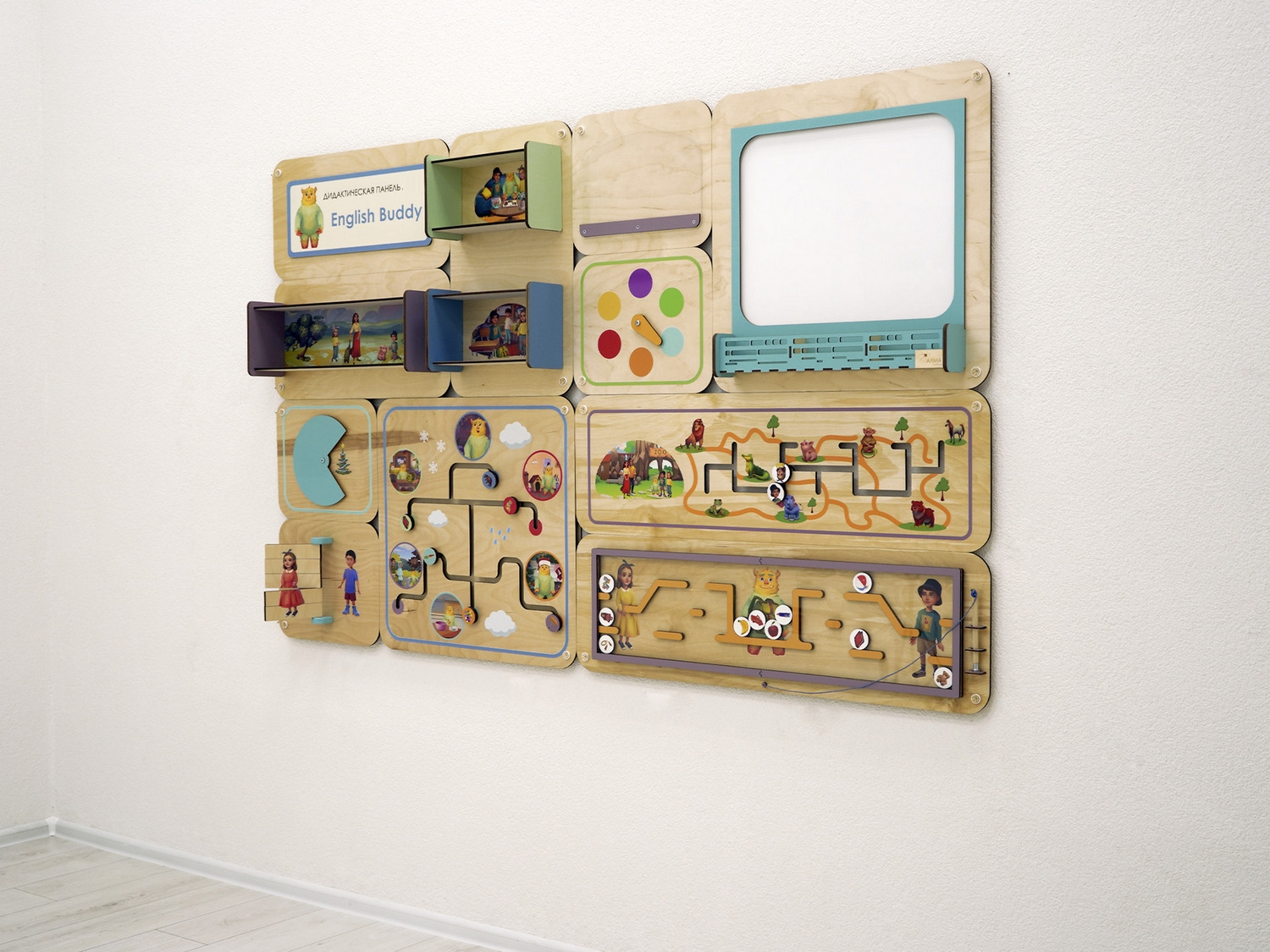 Настенная образовательная панель для помощи дошколятам в изучении английского языка. Состоит из четырёх отдельных модулей, которые можно группировать по желанию и потребностям преподавателя. Лабиринты, поворотные флажки и другие игровые элементы панели развивают логическое мышление, память, цветовосприятие, тренируют мелкую моторику рук. Сочетается с методическим комплексом English Buddy.
