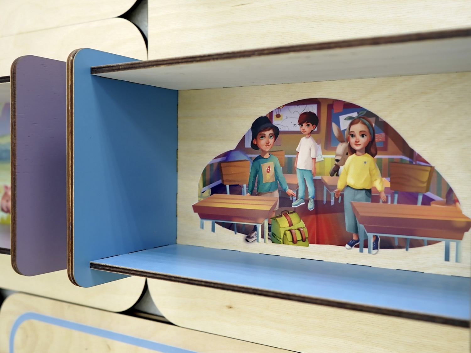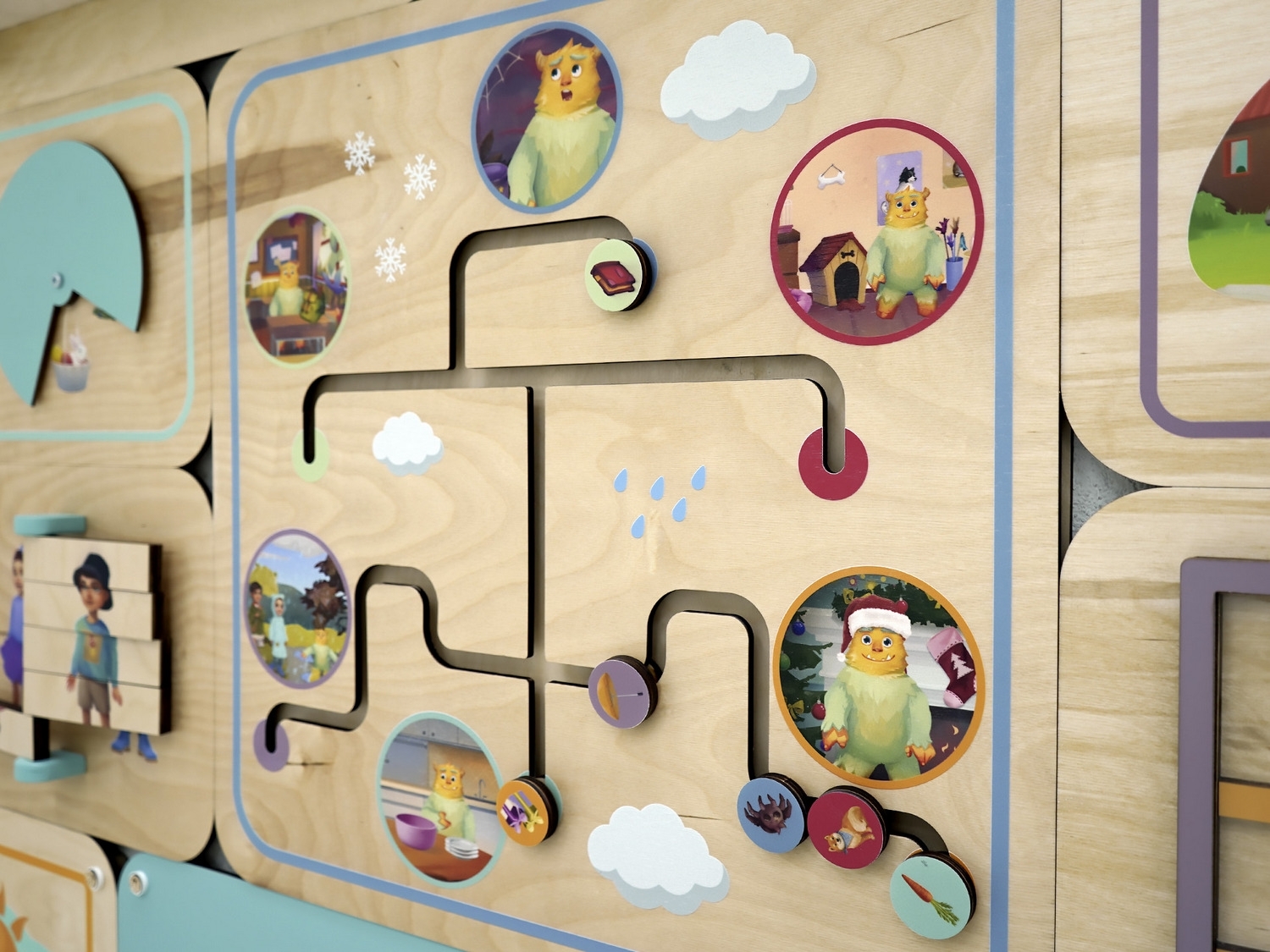 Лабиринт «Ситуации» учит детей строить рассказ по картинке. Малыши описывают картинки с помощью знакомых слов и конструкций и подбирают к каждой ситуации подходящий предмет.