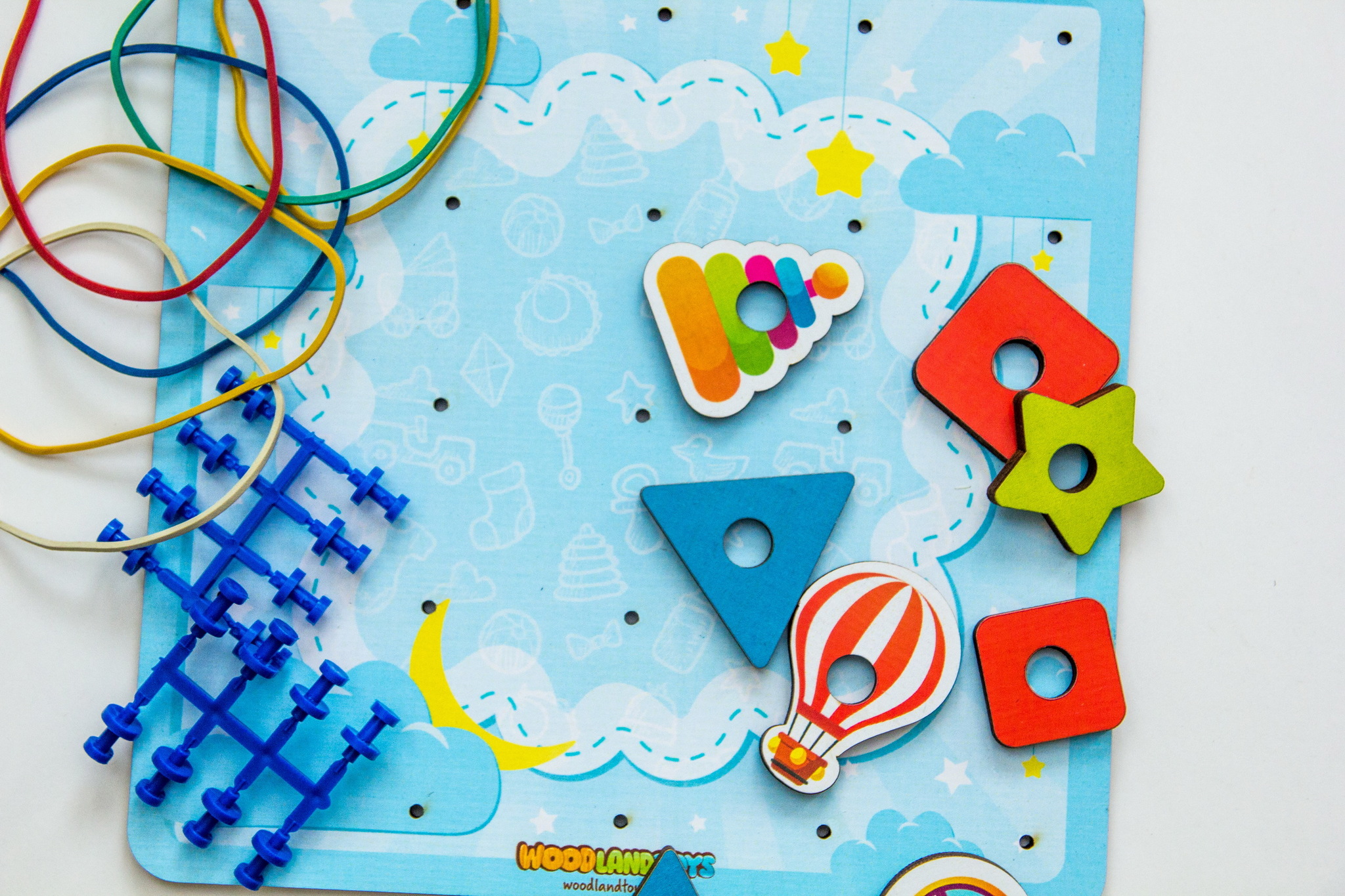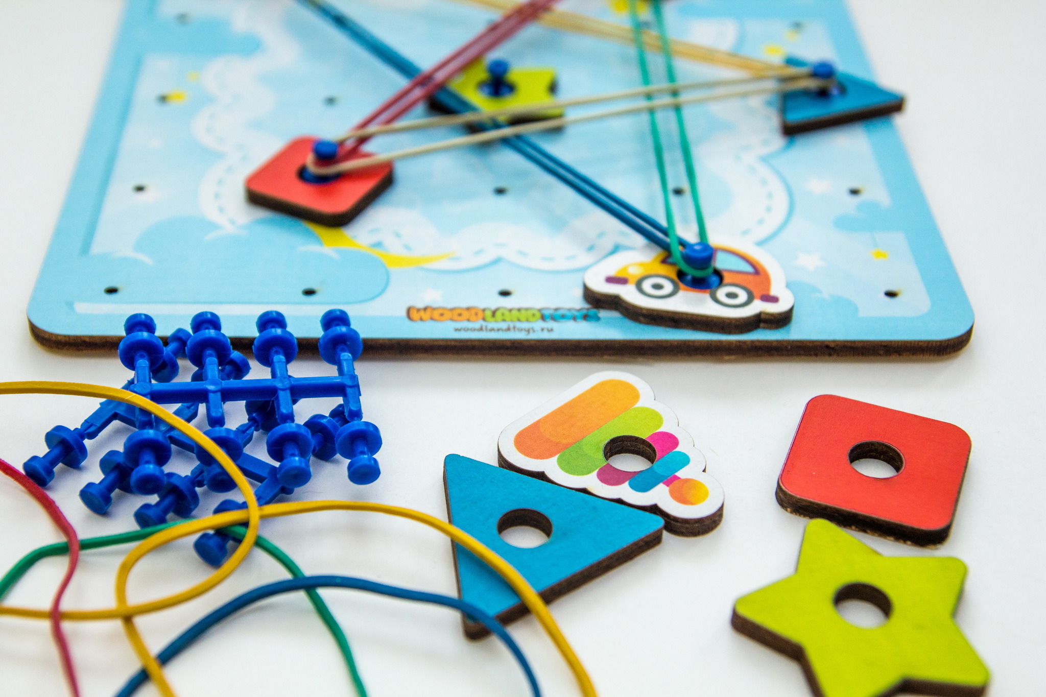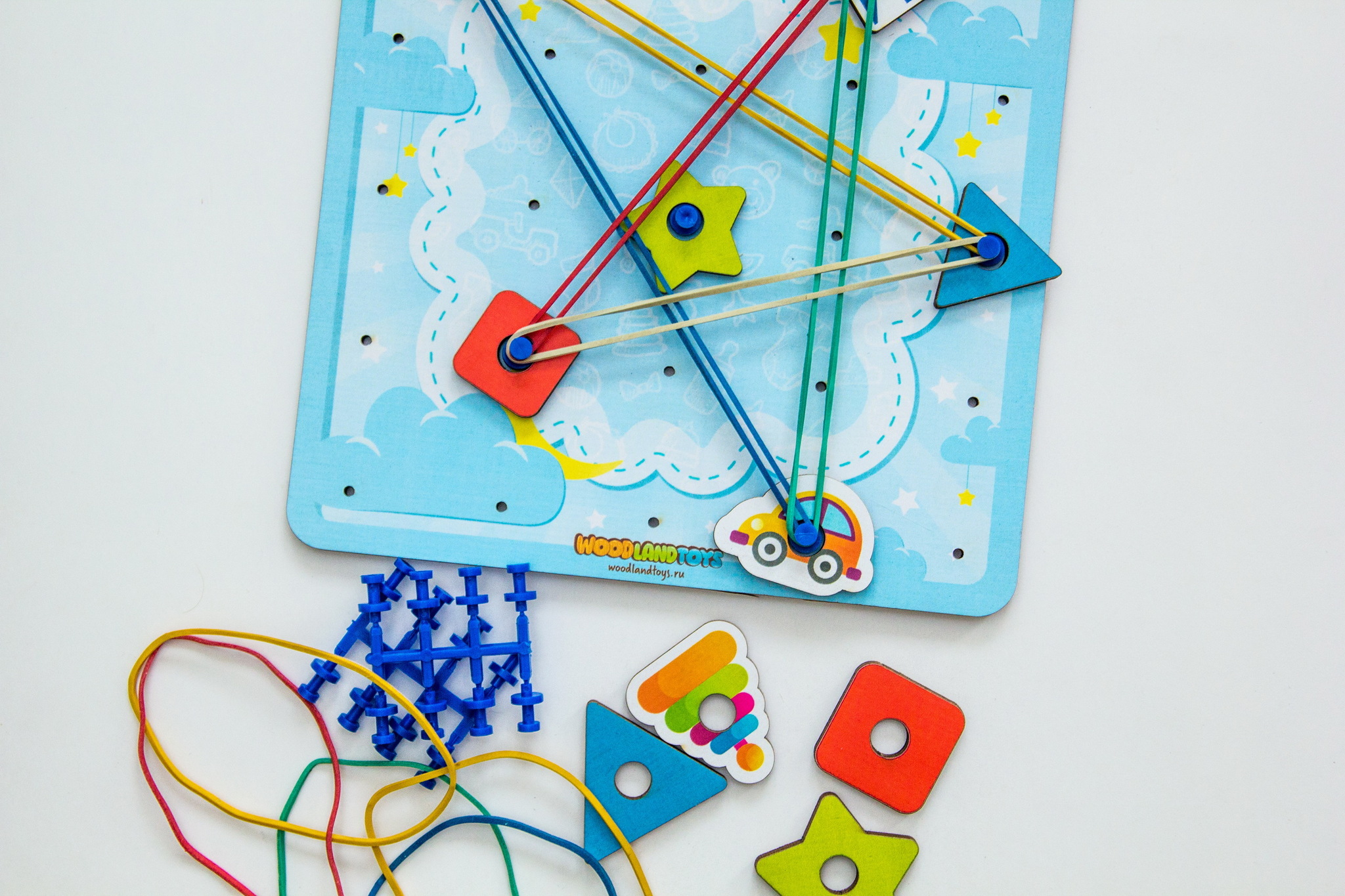 Геоборд представляет собой деревянное поле с тематическим изображением, на котором расположено 25 штырьков (5 рядов и 5 столбцов), тематические фигуры, схемы сборки и набор цветных резинок.