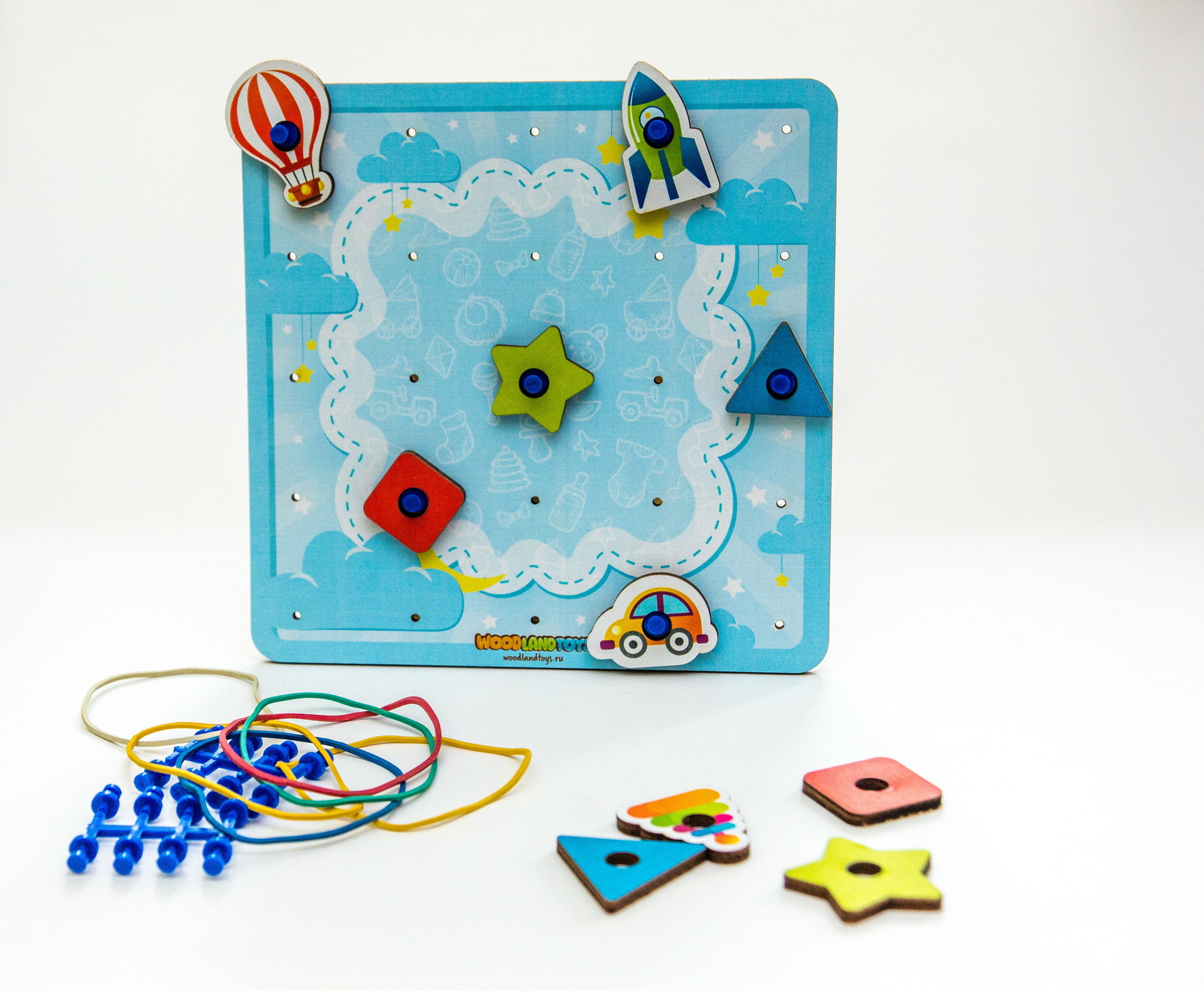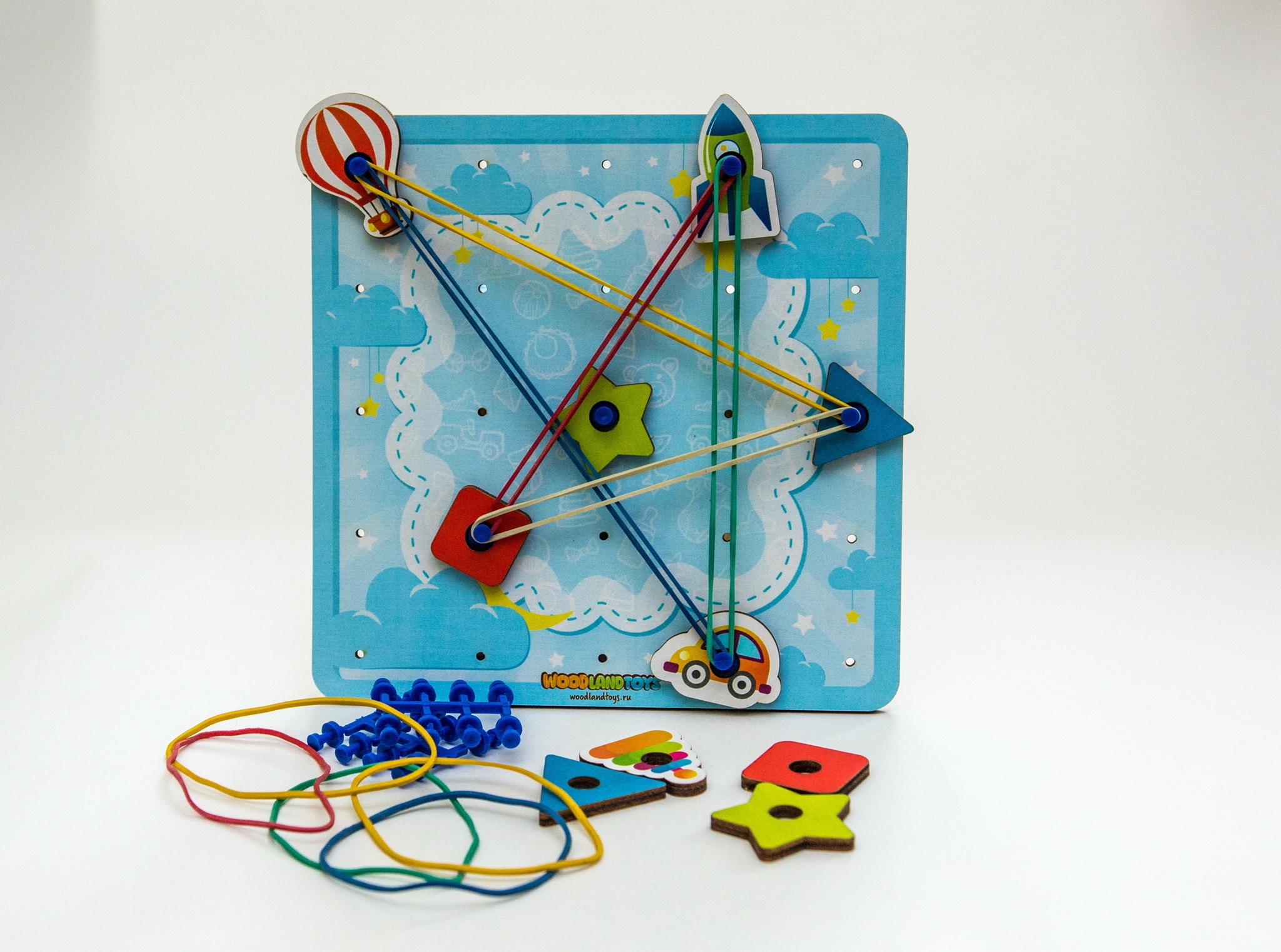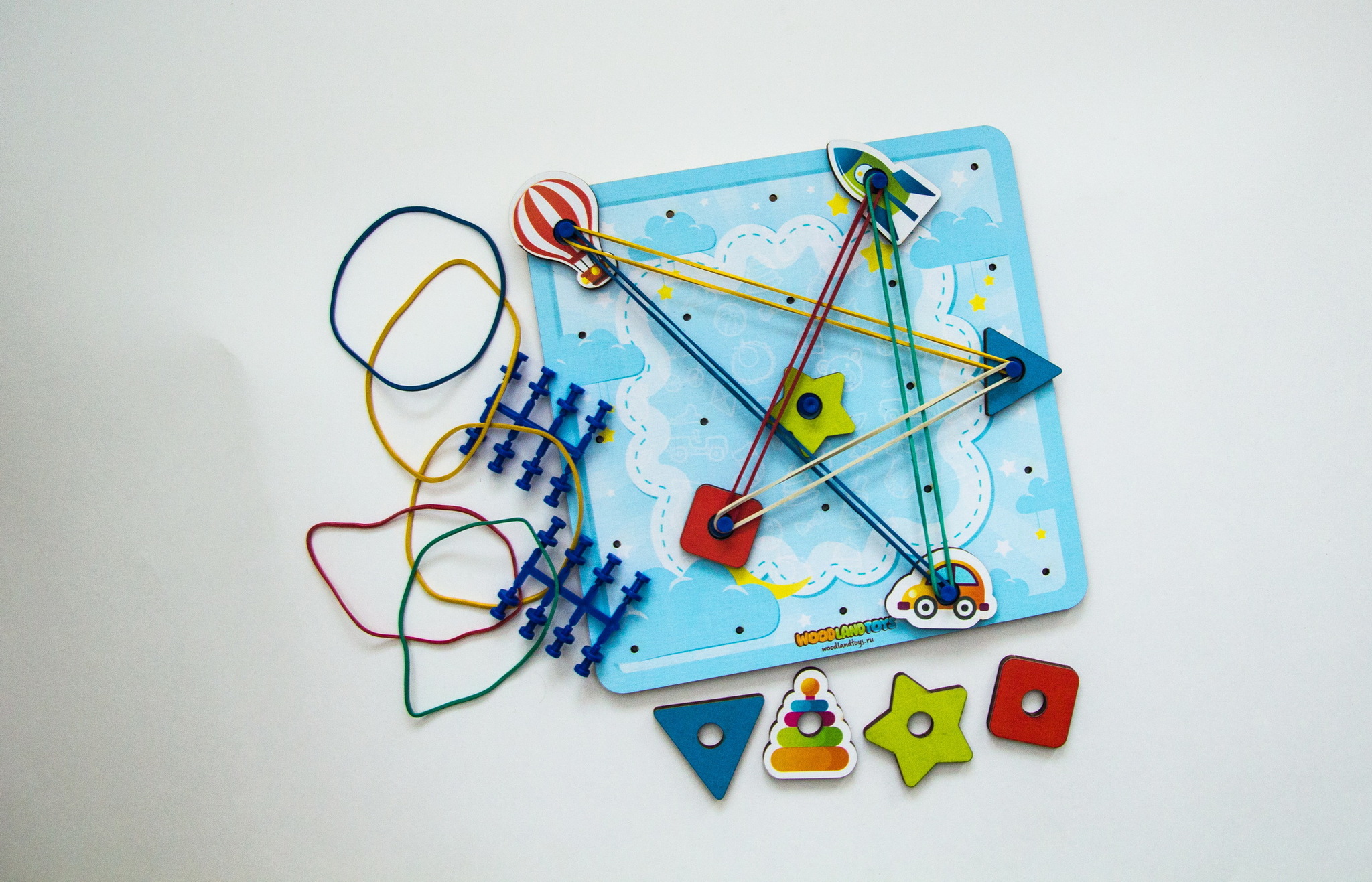 Задача ребенка на штырьки натягивать резинки для получения всевозможных силуэтных изображений – букв, цифр, геометрических фигур, сюжетных картинок. Ребенок может повторить готовую схему или придумать свое собственное изображение. Наличие дополнительных тематические элементов, помогает разнообразить игровую деятельность, развивая воображение и фантазию.