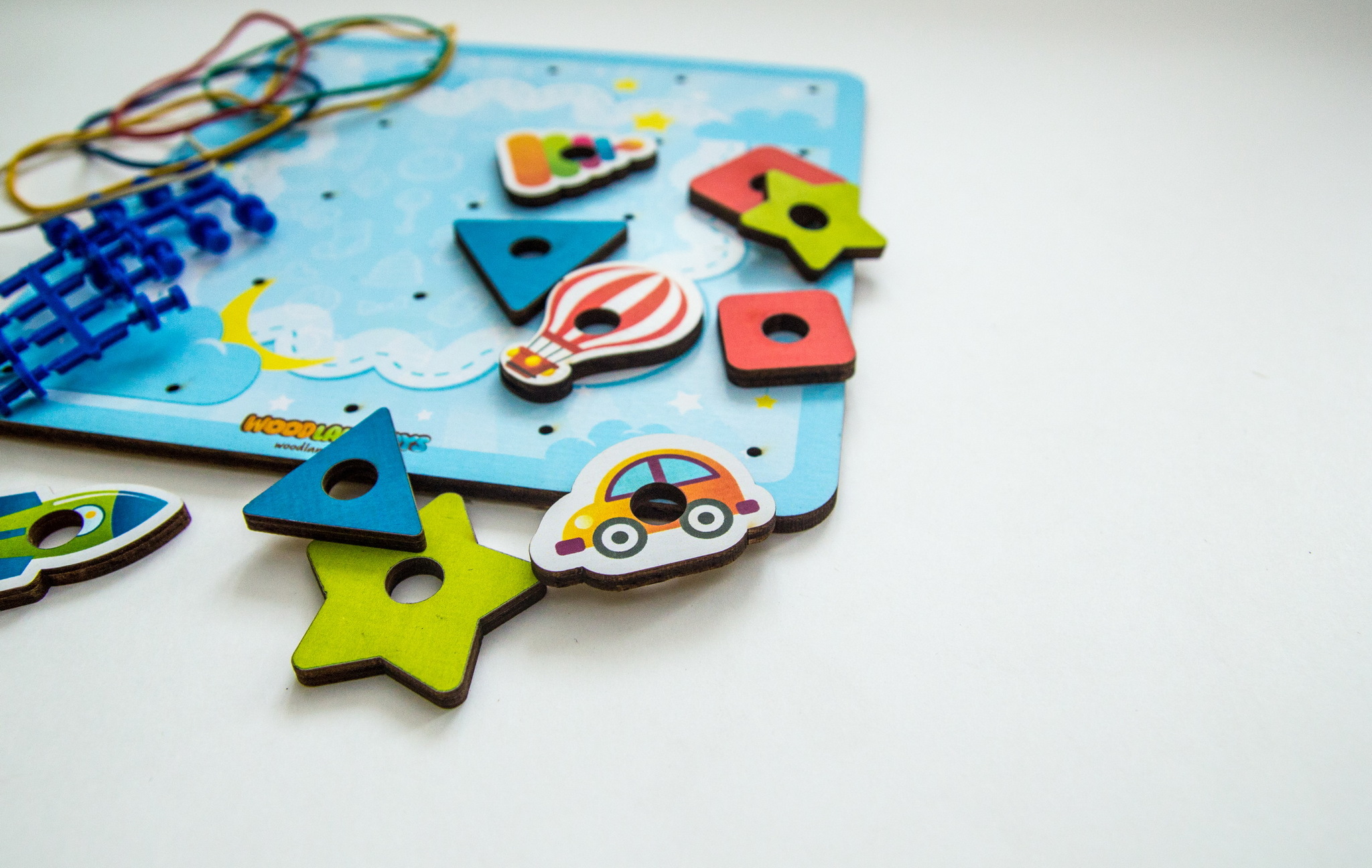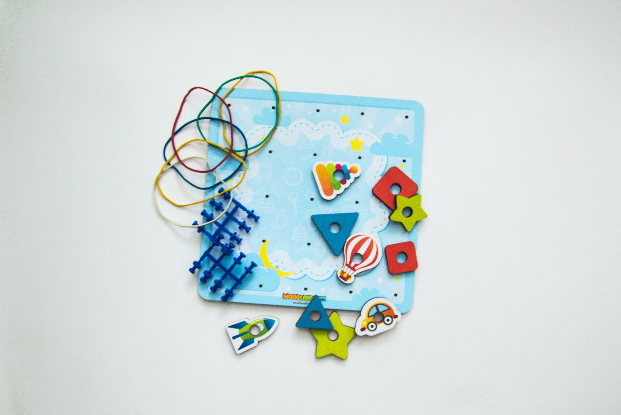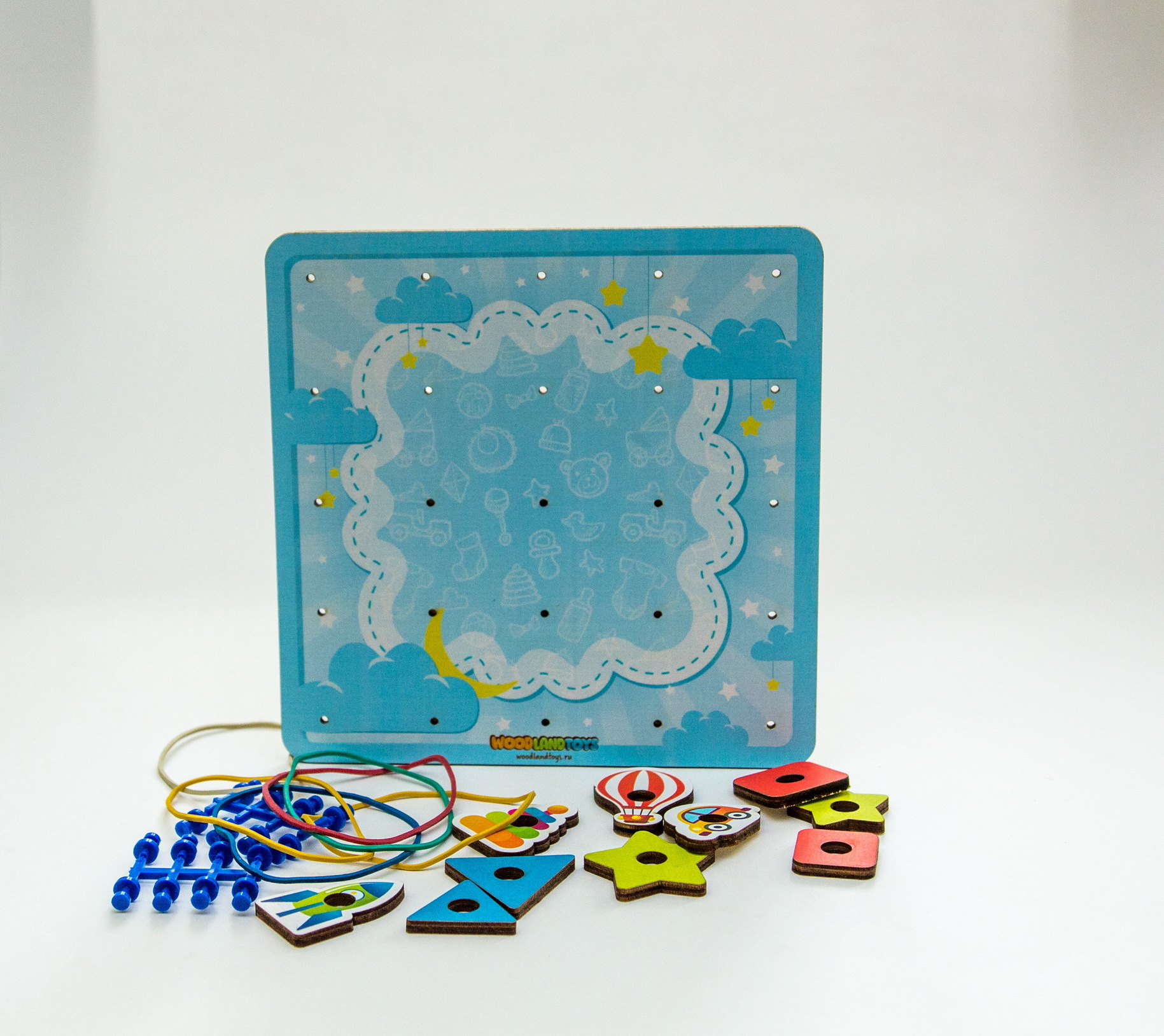 Задача ребенка на штырьки натягивать резинки для получения всевозможных силуэтных изображений – букв, цифр, геометрических фигур, сюжетных картинок. Ребенок может повторить готовую схему или придумать свое собственное изображение. Наличие дополнительных тематические элементов, помогает разнообразить игровую деятельность, развивая воображение и фантазию.