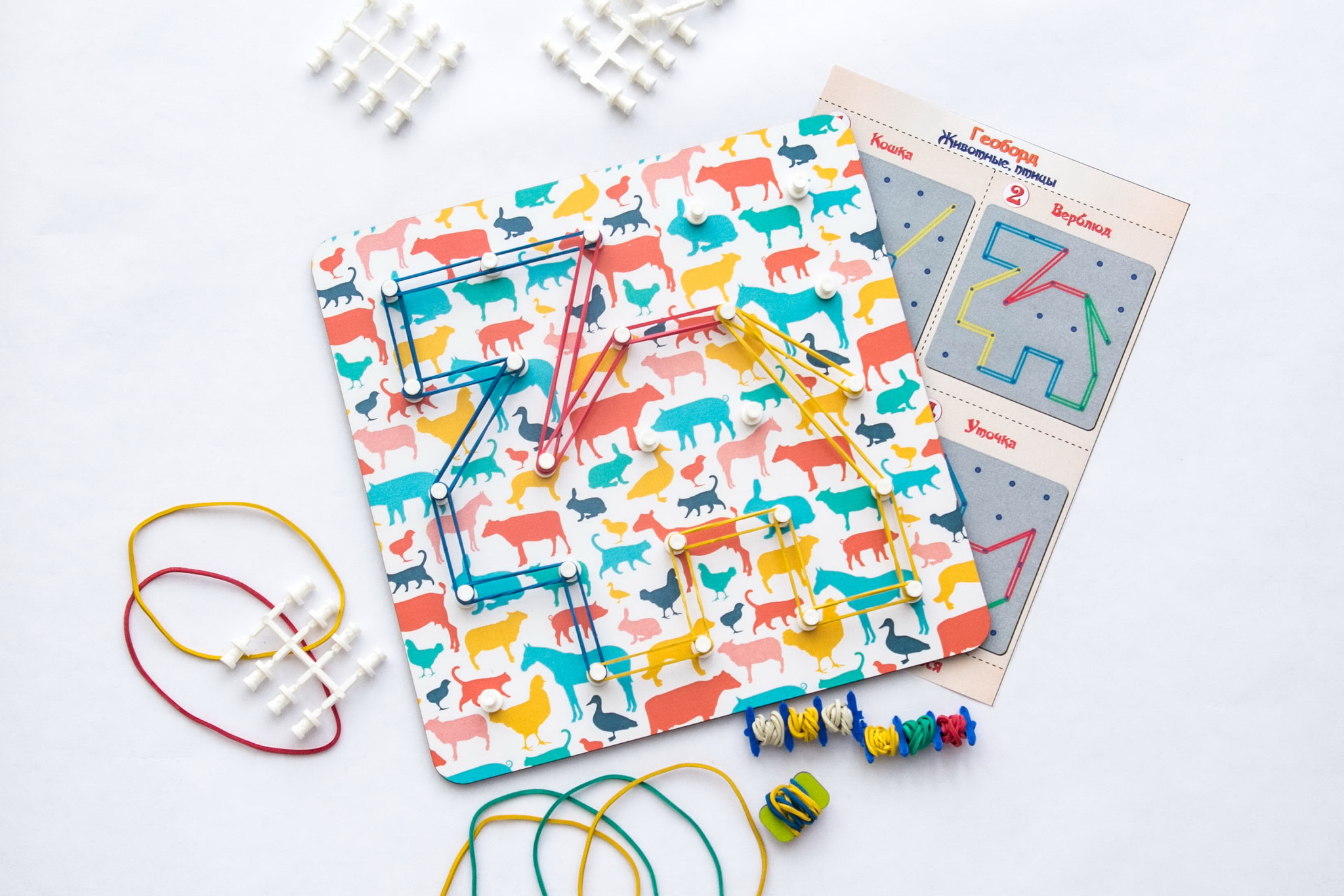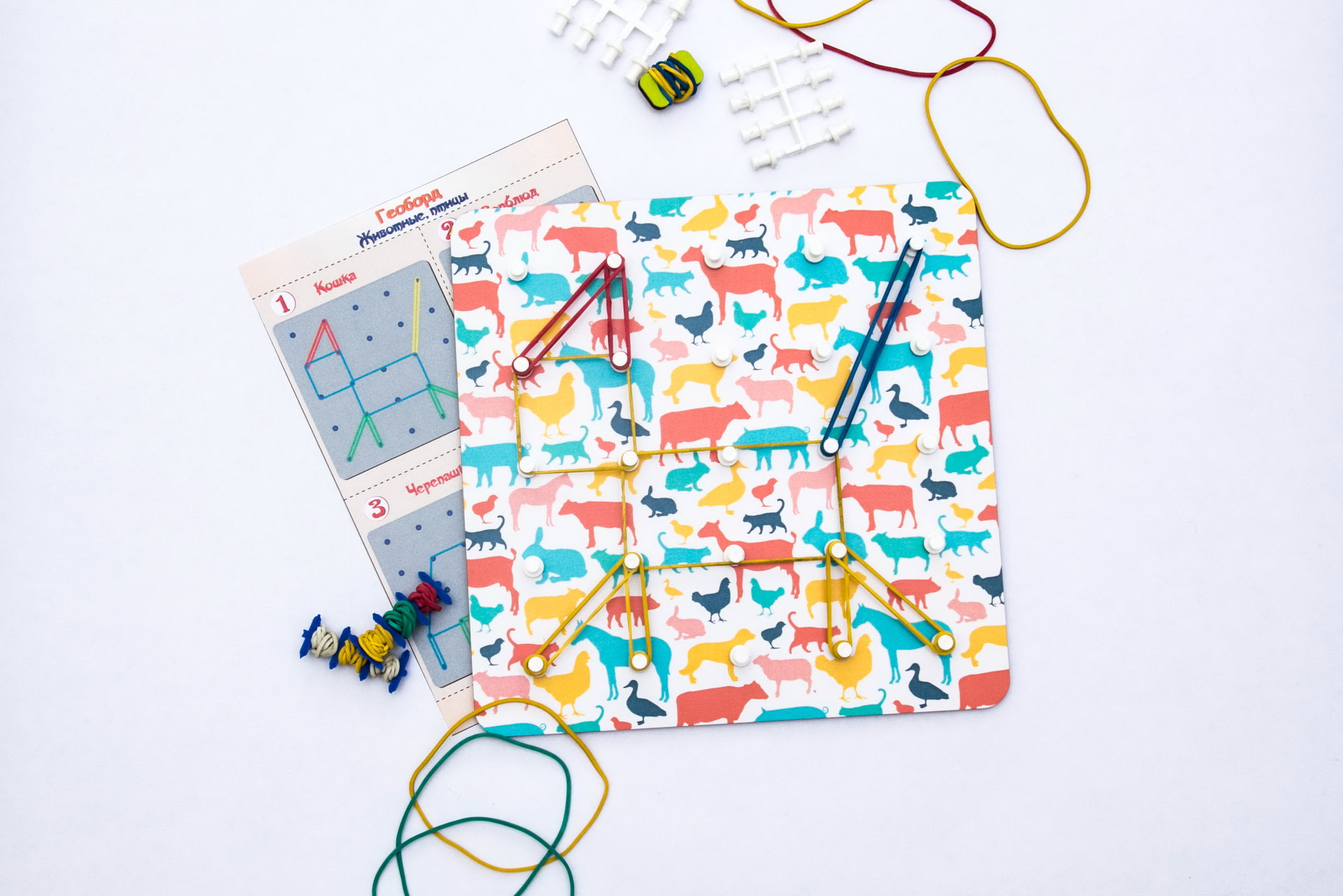 Геоборд представляет собой красочное поле с тематическим орнаментом, на котором расположено 25 штырьков (5 рядов и 5 столбцов), набор цветных резинок, схемы сборки.