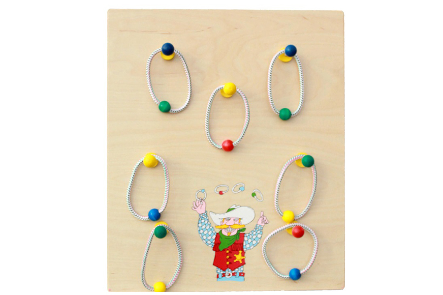 Игровая задача - на каждый из штырей накинуть кольцо из цветного жгута с деревянным шариком внутри, окрашенным в тот же цвет. Панель со штырями можно располагать и на полу и тогда набрасывать кольца – жгуты на горизонтально лежащие цели.