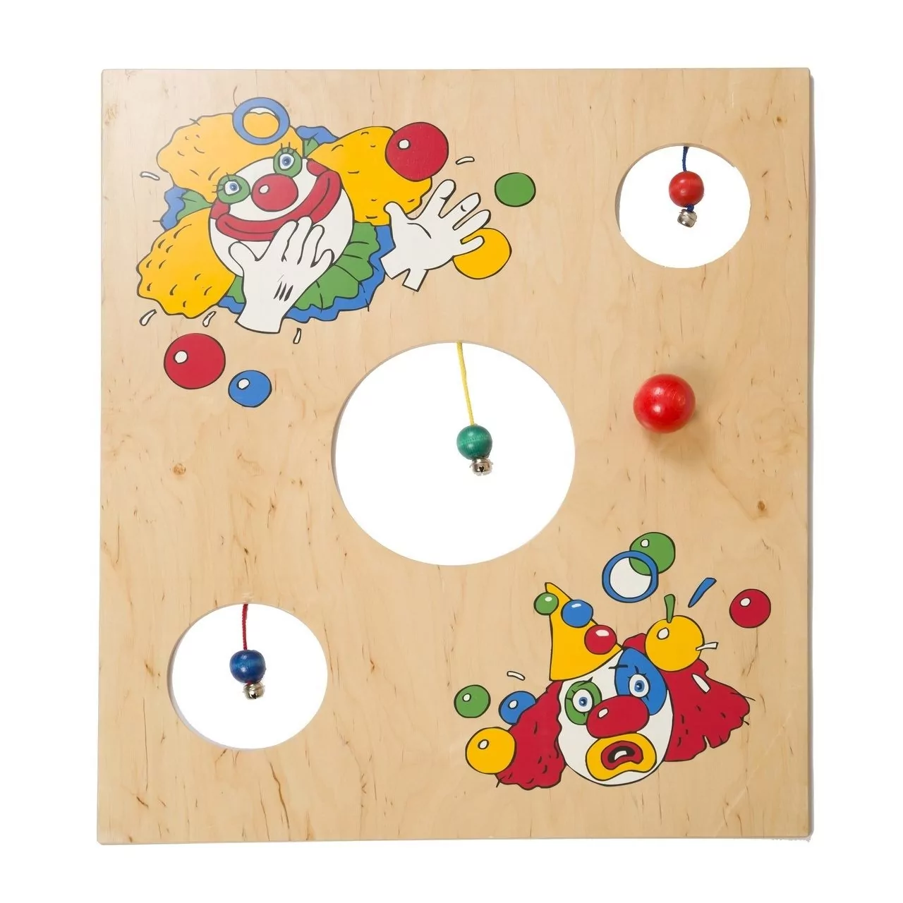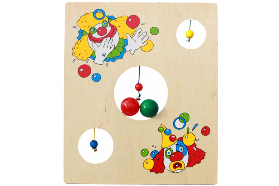 Панель с тремя вырезанными в нем круглыми отверстиями, размещенными по диагонали, среднее отверстие - большего размера по сравнению с двумя крайними. Внутри круга подвешены своеобразные мишени - цветной колокольчик на шнурке. Цель игры - попасть в мишени цветным шариком с определенного расстояния. Пригласите друзей своего малыша и устройте им веселые соревновательные игры и конкурсы, в том числе и командные, на меткость, точность, дальность, скорость.