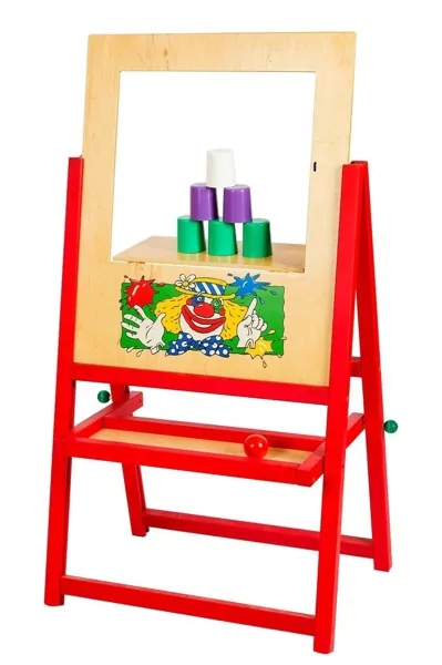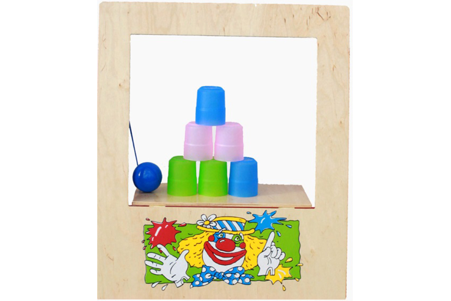 «Экран» с откидным «окном – стойкой», на стойке в виде полки помещаются легко сбиваемые «мишени» - 5 стаканчиков. В комплект входят 3 разноцветных пластиковых мячика для стрельбы по мишеням. Веселый, забавный клоун, изображенный снизу «экрана», словно приглашает к состязанию в меткости.
