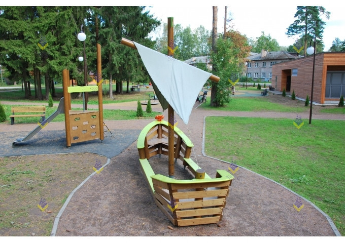 Игровой дворик «Лодка» создан специально для украшения детской площадки, создания интересного места для игры. Он представляет собой модель корабля с парусом, флагом и другими характерными элементами.