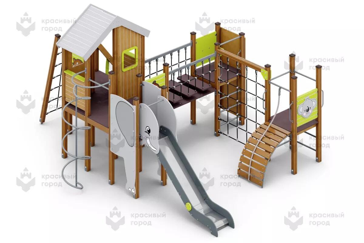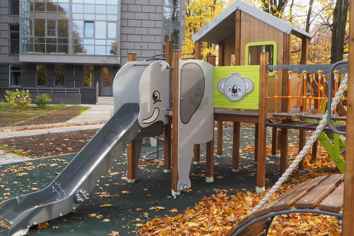 Игровой комплекс «Джунгли спорт» - здесь преобладают коричневые и зеленые оттенки. Горка стилизована под хобот слона, стенки-ограждения украшены милыми мордочками льва, коалы и мартышки.