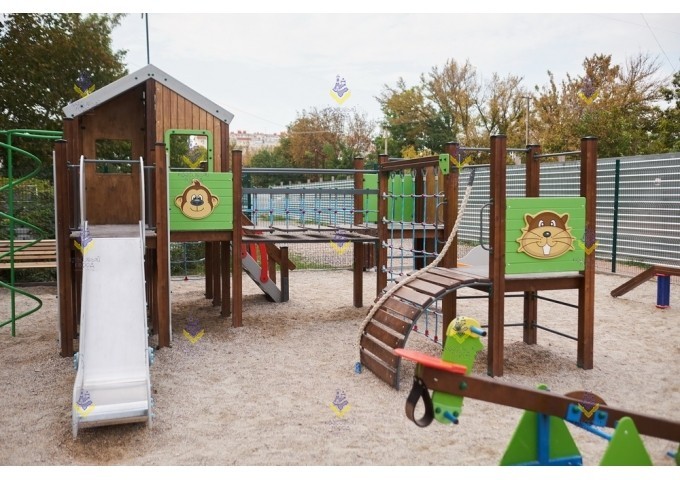 Комплекс включает в себя несколько элементов, которые позволяют весело проводить время и улучшать уровень физического развития ребенка. В конструкции комплекса есть горка, канатная лестница, спираль, подвесной мост и множество других элементов. Это создает все нужные условия для игры сразу нескольких детей и каждому будет весело и интересно.