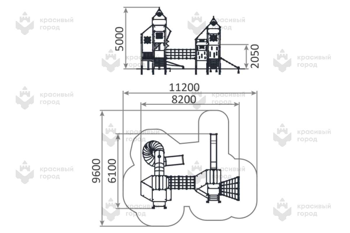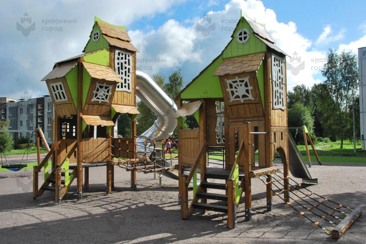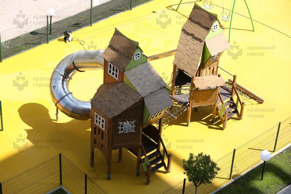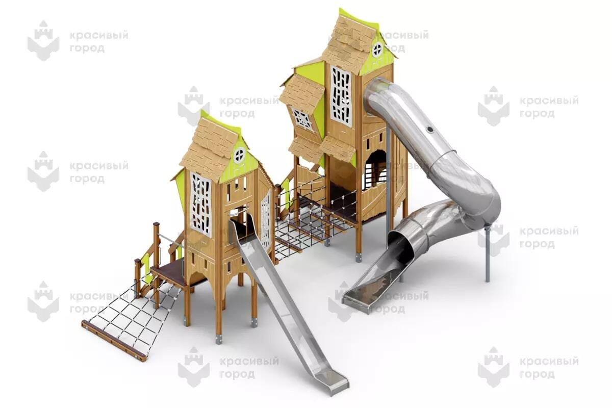 Игровой комплекс из серии «Небесное дерево» тип-3 включает в себя две башни, прямую и винтовую горку из нержавеющей стали, веревочную сетку для подъема и канатный мостик для перехода между башнями. Закрытые башни-домики станут удобным местом для игр, даже в плохую погоду. Здесь каждый ребенок сможет найти что-то интересное для себя.