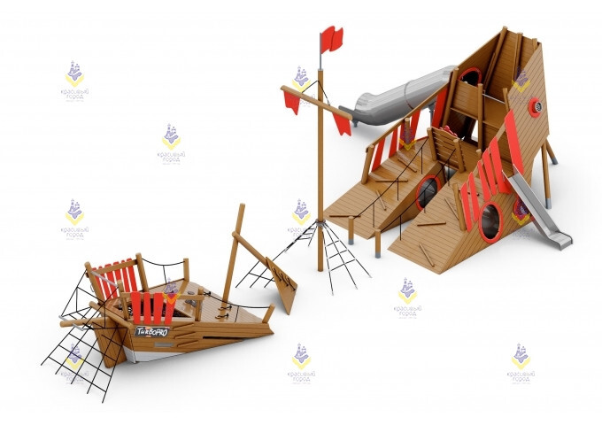 Необычный игровой комплекс «Пиратский корабль» даст возможность детям примерить на себя роль настоящего пирата и капитана корабля. Детская площадка включает в себя множество элементов для активных игр, как большой компанией, так и в одиночку. Здесь есть открытая и закрытая горка, туннели, всевозможные веревочные сетки для лазания и лестницы. Скучать тут точно не придется!