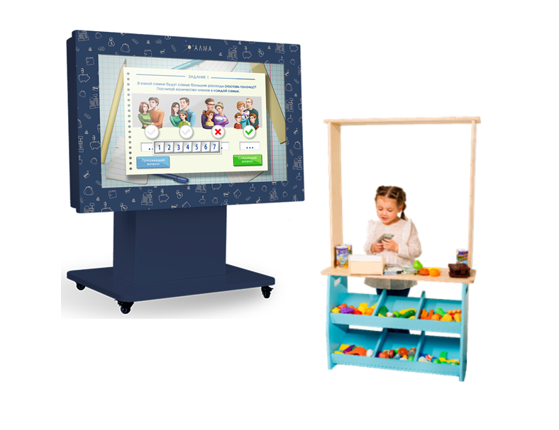 Помимо интерактивного стола в комплекте есть реквизит для традиционных игр: детский киоск «Магазин» с кассой, тележкой и продуктами. Макеты денег и пластиковых карт, копилки, кошельки, наборы для групповых игр, что способствует усвоению навыков на практике.