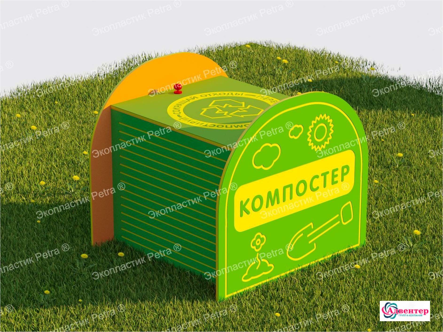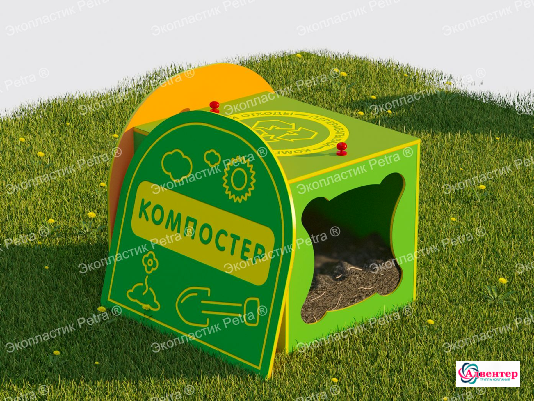 Это настоящий мини-завод по переработке мусора, который позволяет юным фермерам наблюдать и участвовать в очень важном процессе превращения мусора в полезные удобрения. Дети учатся сортировать мусор на органические и неорганические отходы. То, что подлежит переработке, участники игрового процесса складывают в компостер, поливают его водой и наблюдают за перегниванием. Так получается компост – земля, наполненная большим количеством полезных удобрений, которая в дальнейшем будет использоваться для выращивания различных растений. Например, в игровом комплексе «Фермерский дворик» есть цветник-повозка и грядка с теплицей, где дети смогут выращивать настоящие растения. Там компост будет как раз кстати!
