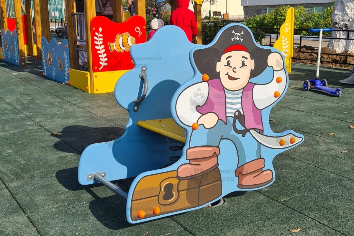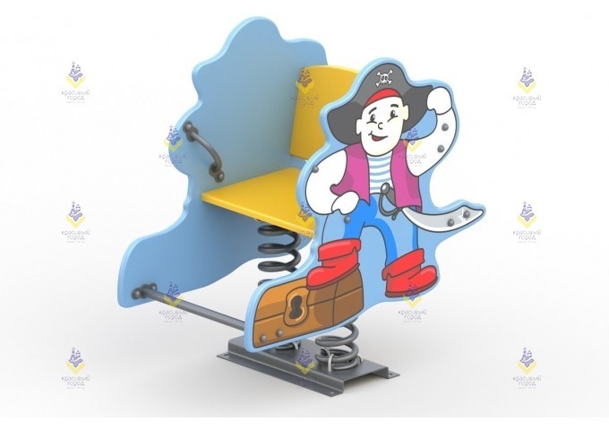 Детская качалка на пружине «Пират» будет удачно смотреться в тематике «Морская». На оборудовании изображен веселый пират, приглашающий детей отправиться за сокровищами.