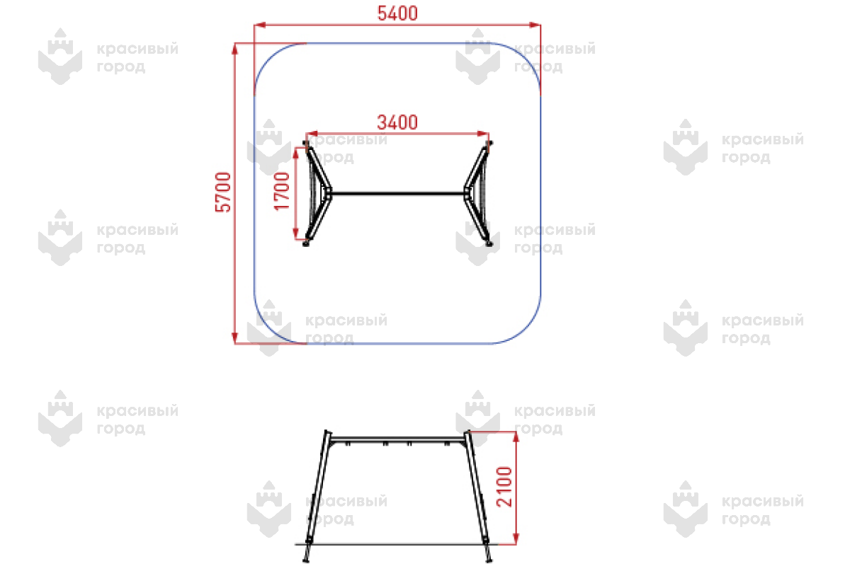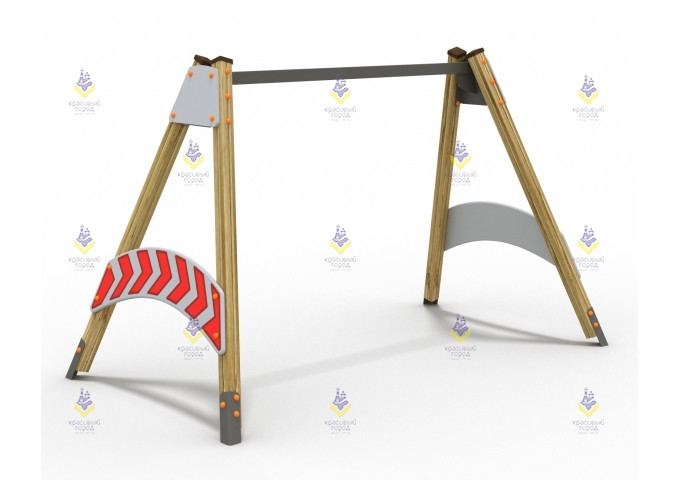 Конструкция представляет собой вертикальную перекладину, которая установлена на четырех опорных деревянных столбах из сосны. Можно подвесить пару качелей на выбор: подвес «Комфорт», люльку или резиновый. Применение в изготовлении качественных материалов помогает обеспечить стойкость к значительным нагрузкам. Изделие ориентировано на возрастную группу от 3 до 12 лет.