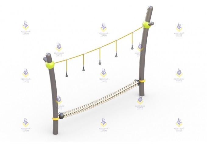 Детские спортивные канатные комплексы «Переправа» компактны и устроены очень просто. Между двух опор натягиваются армированные канаты – один сверху и один снизу. Ребенку нужно перемещаться по нижнему, держась руками за свисающие сверху опоры.
