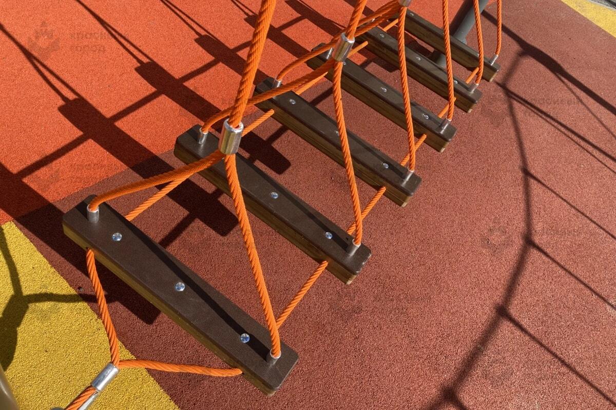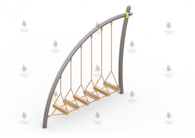 Несмотря на небольшие габариты, комплекс «Канатный переход» отличается оригинальностью и функциональностью. Он представляет собой подвесную лестницу, армированный канат которой имеет 6 ступенек. Такой элемент детской площадки подходит для детей от 6 до 12 лет и станет идеальным местом для их лазания и активных игр.