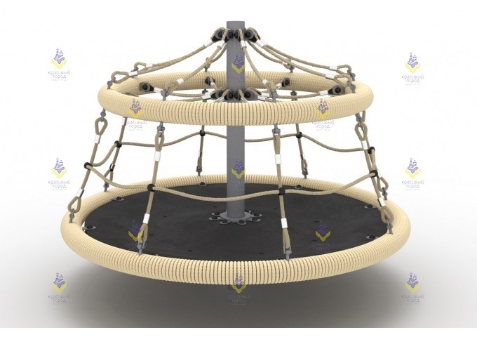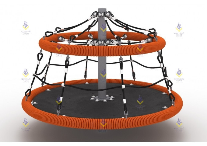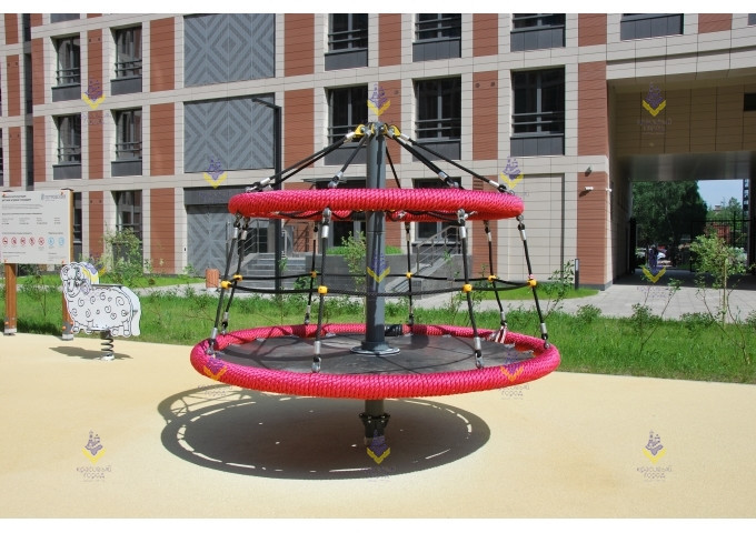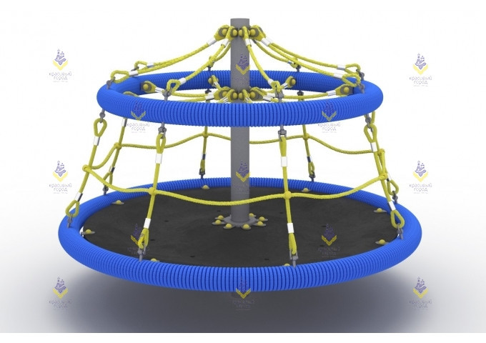Конструкция предполагает установку на центральное вращающееся основание круглой упругой резиновой площадки. Она соединена с еще одним обручем сетью канатов, за которые дети могут держаться во время катания.