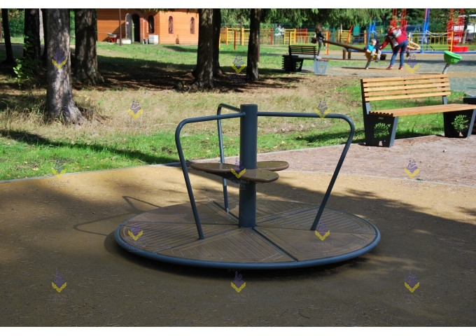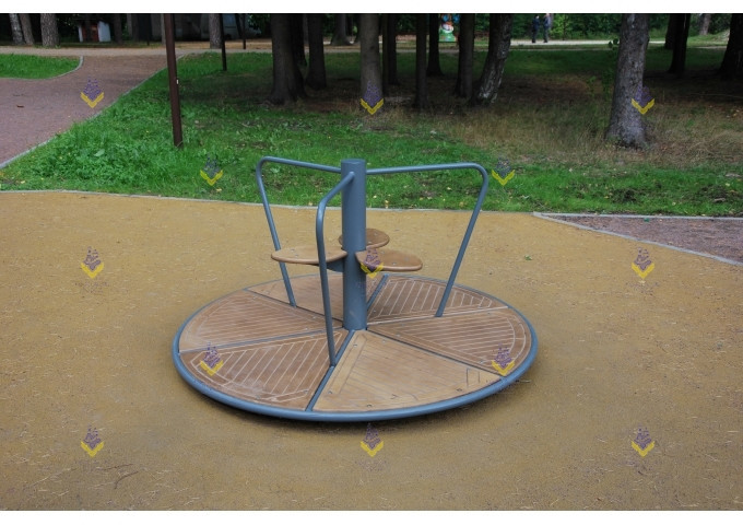 Карусель малая тип-1 – разновидность одной из самых популярных моделей. Её отличие от оригинала – использование вместо фанеры HPL-пластика, поверхность которого выглядит как натуральное дерево. HPL-пластик очень прочен, он меньше подвержен изнашиванию нежели стандартное решение из фанеры.