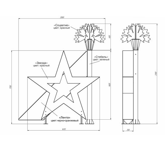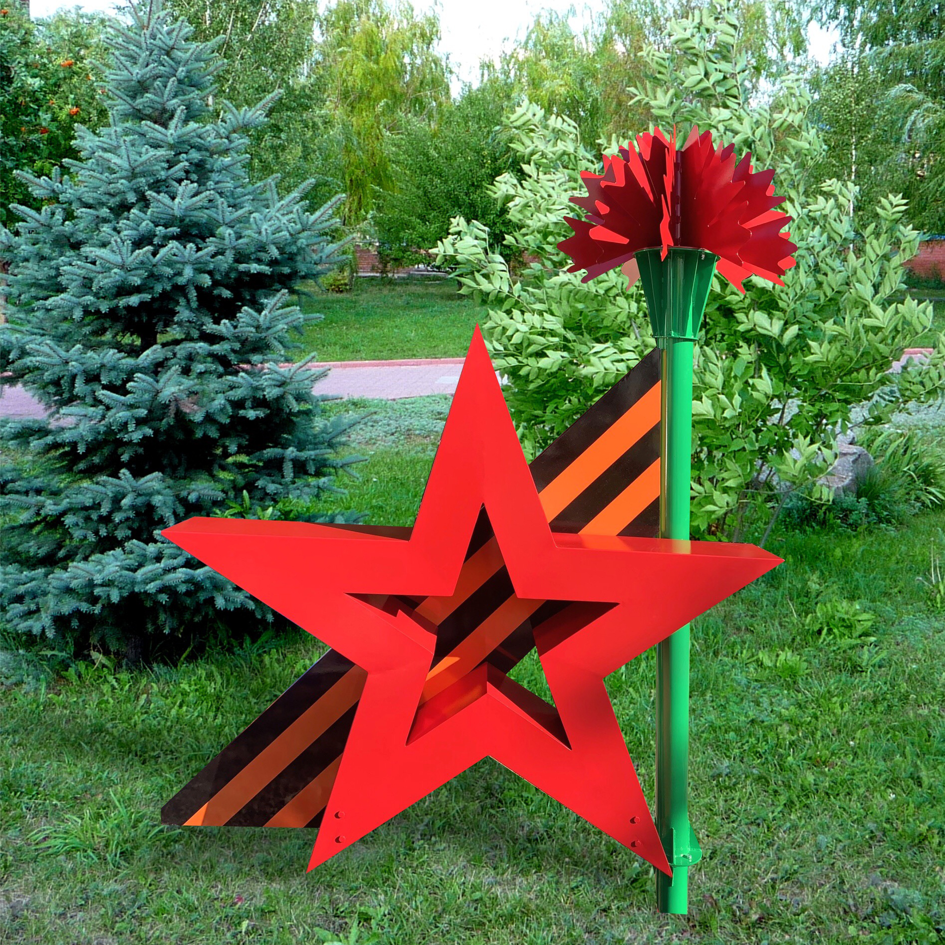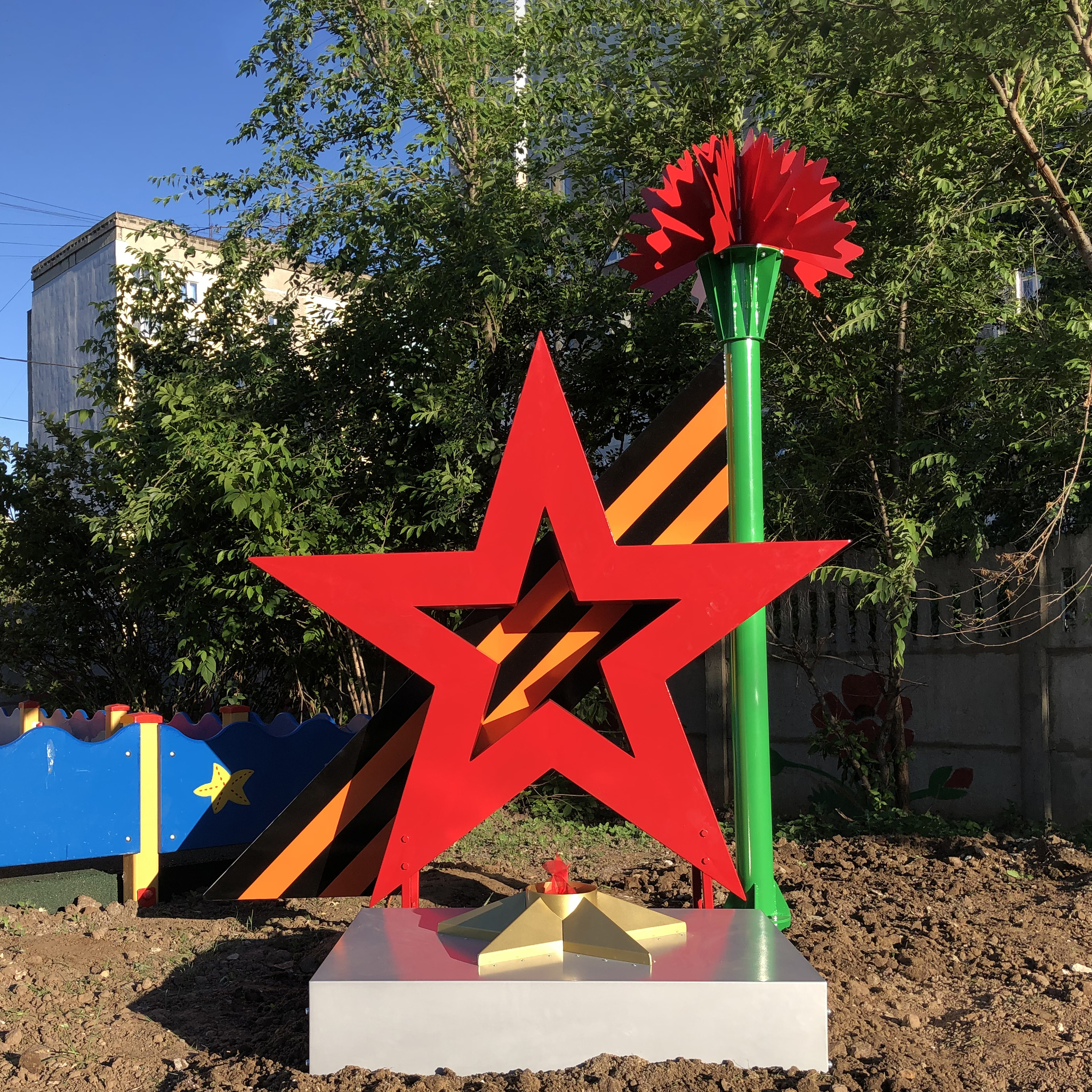 Развивающий модуль «Стела Победы» представляет собой масштабную имитацию памятника, состоящего из геральдического знака Красной Звезды – символа Красной армии, памятного цветка гвоздики и Георгиевской ленты - символа героизма, воинской доблести и славы защитников нашей страны.