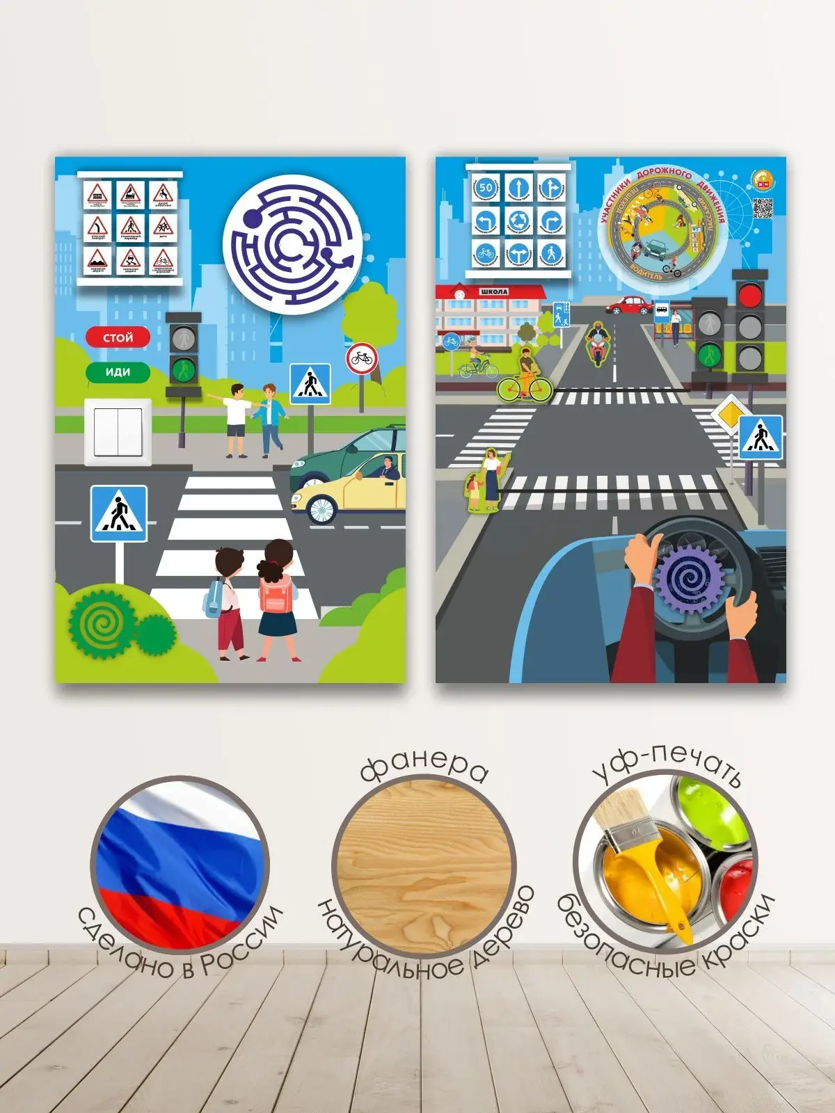 4. Развивающий потенциал: Разнообразие интерактивных элементов, таких как кубики с дорожными знаками, дисковый лабиринт и водилки для изучения участников дорожного движения, способствует развитию моторики, внимания и навыков безопасного поведения на дорогах.