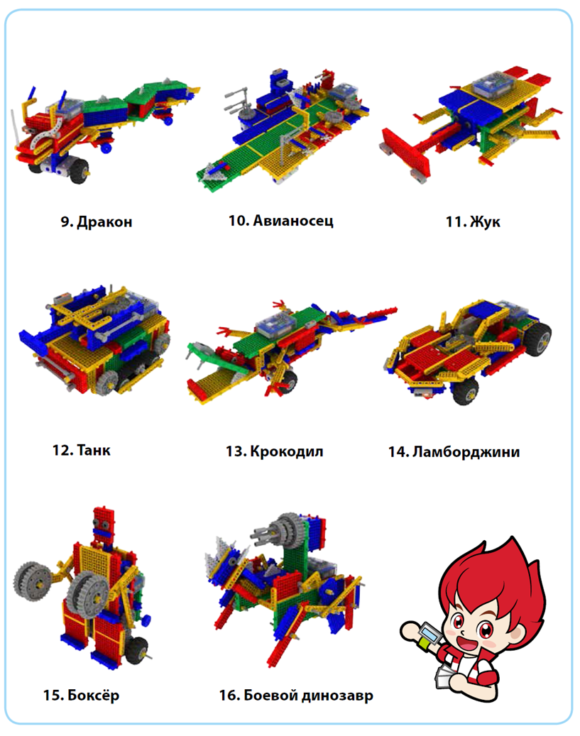 Можно дополнительно собрать по стандартным схемам сборки не менее 16 шт. моделей роботов (помимо 20 стандартных моделей на основе карт сборки MRT1 Brain А), а также неограниченное количество проектов по замыслу ребенка.