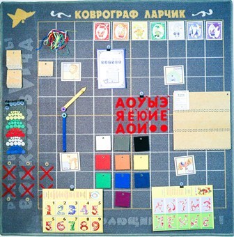Коврограф «Ларчик» - уникальное пособие, избавленное от многих недостатков школьной доски и фланелеграфа. Большая сила сцепления ковролина с контактной лентой позволяет прочно закреплять на коврографе наглядный материал. Оригинальные элементы: зажимы, кармашки, кружки, веревочки обеспечивают разнообразие, наглядность и динамичность занятий.