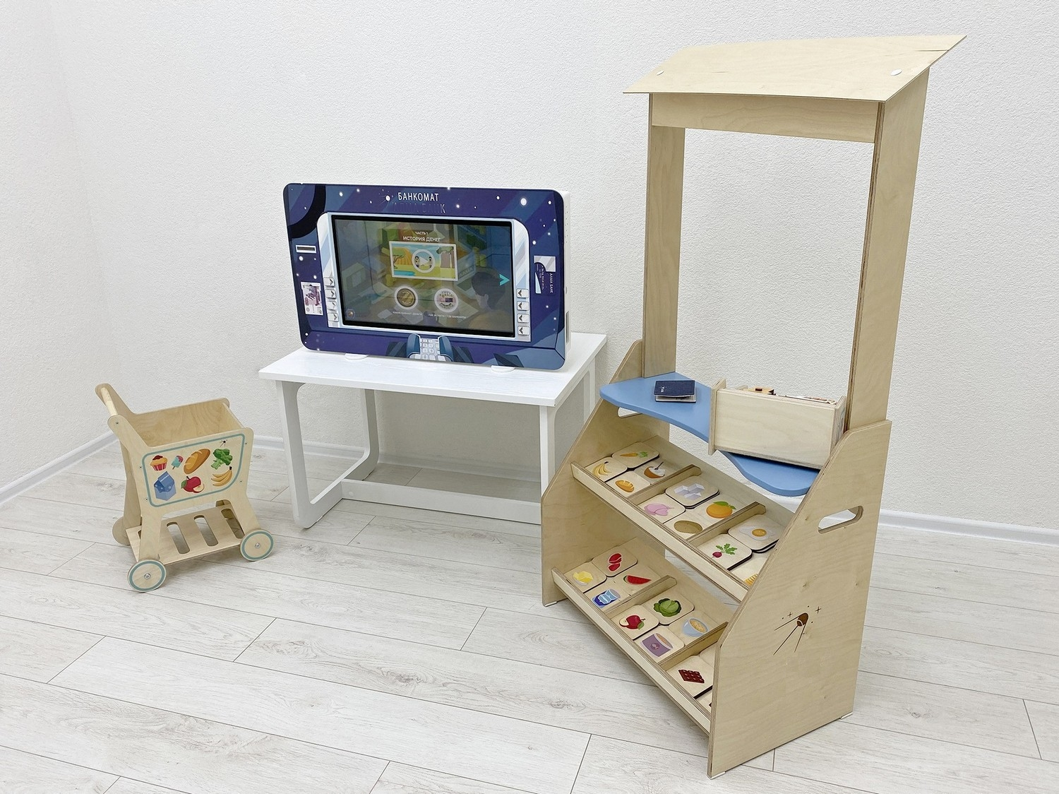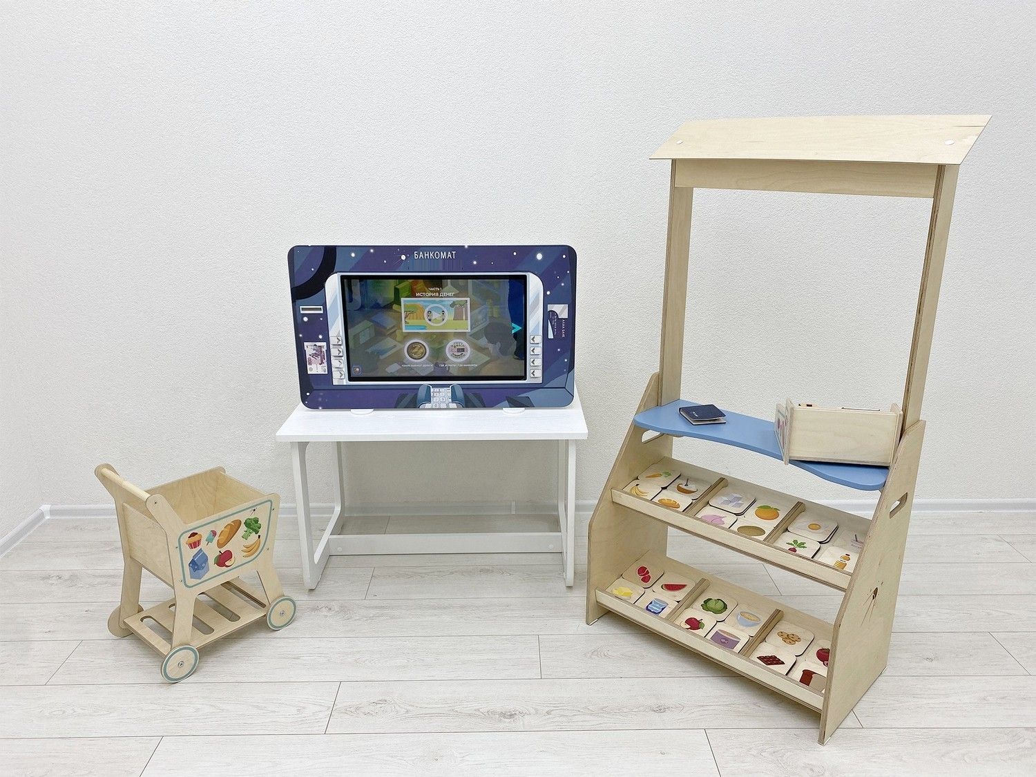 Дидактические игры: детский киоск «Магазин» с кассой, тележкой и продуктами. Макеты денег и пластиковые карты, копилки, кошельки, наборы для групповых игр по усвоению навыков финансовой грамотности на практике.