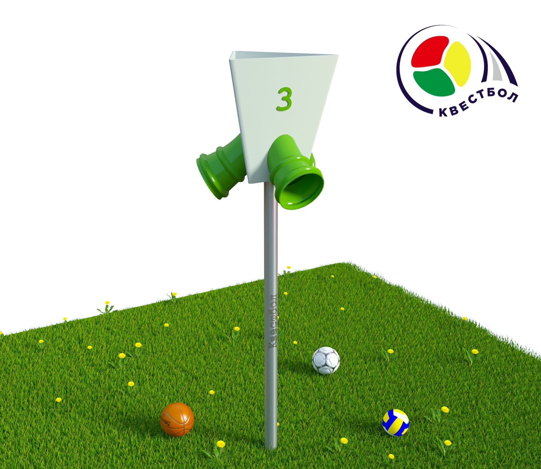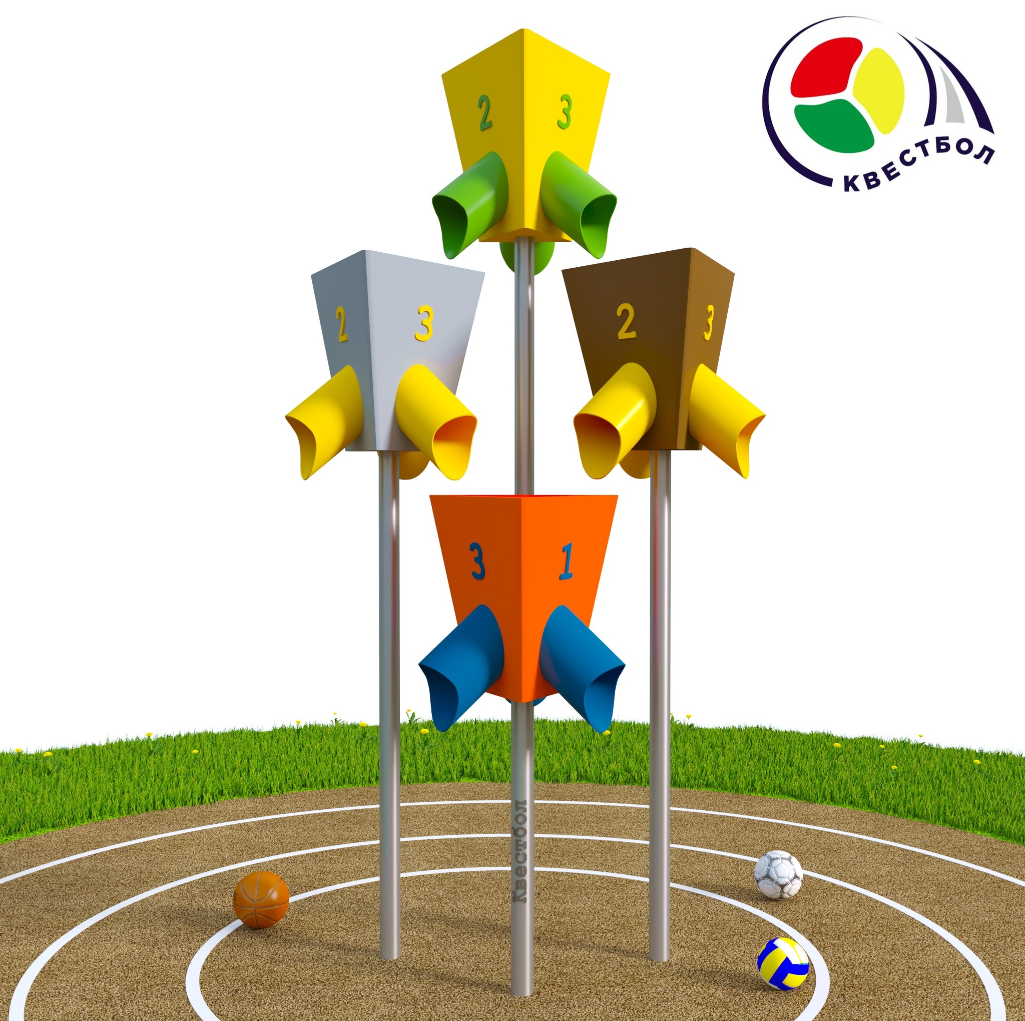 Спортивный развивающий модуль Квестбол представляет собой воронку яркого цвета и необычной формы. У неё есть 3 или 4 трубы для вылета мяча. Цель – попасть мячом в воронку. За счёт оригинальных свойств воронки мяч вылетит из той трубы, из которой получится. Просчитать бросок не удастся. Неожиданный результат - это изюминка игры!