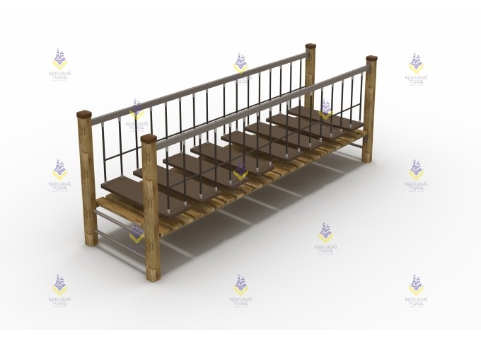 Мостик подвесной «Джунгли» это один из элементов благоустройства для детской площадки, садика или игровой зоны в парке. Он представляет собой деревянные доски, закрепленные на канатах. Вся конструкция подвешивается к опорным столбам и во время перемещения сверху раскачивается из стороны в сторону.