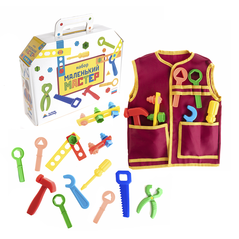 Набор «Маленький мастер» — отличный подарок для любого малыша. Он упакован в большую картонную коробку, в которой можно хранить инструменты. В набор входят около 20 различных предметов. При этом в нем есть не только инструменты, но еще и строительный яркий жилет. С помощью набора малыш сможет разнообразить свои игры и попробовать себя в новой роли!