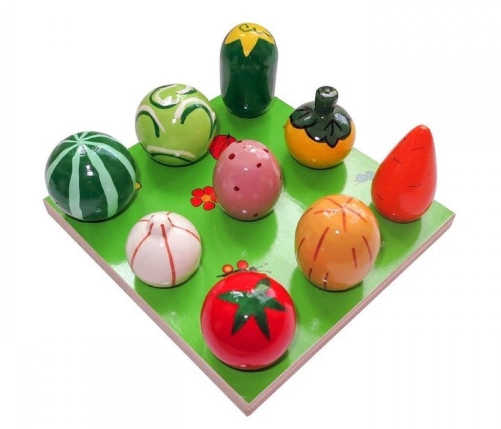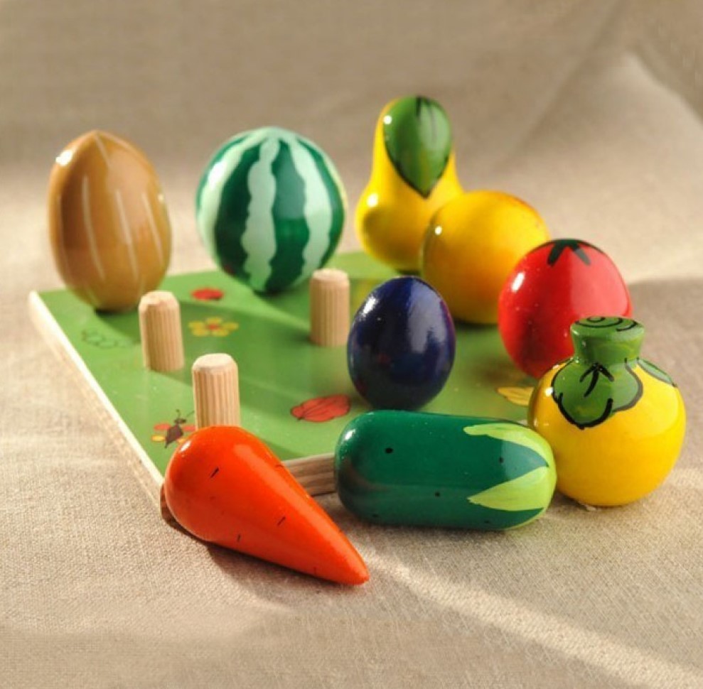 Деревянный Развивающий набор "Веселая Грядка" - Овощи-фрукты, 9 предметов - отличный помощник в изучении цветов, счета, видов фруктов и овощей. Каждая фигурка отлично обработана и покрыта яркой, безопасной краской. В деревянной подставке имеются штырьки, а в каждой фигурке - углубление. Таким образом, фигурки надеваются на подставку и сохраняют устойчивость. Когда ребенок устанавливает фигурку на подставку, у него развивается глазомер и мелкая моторика рук.