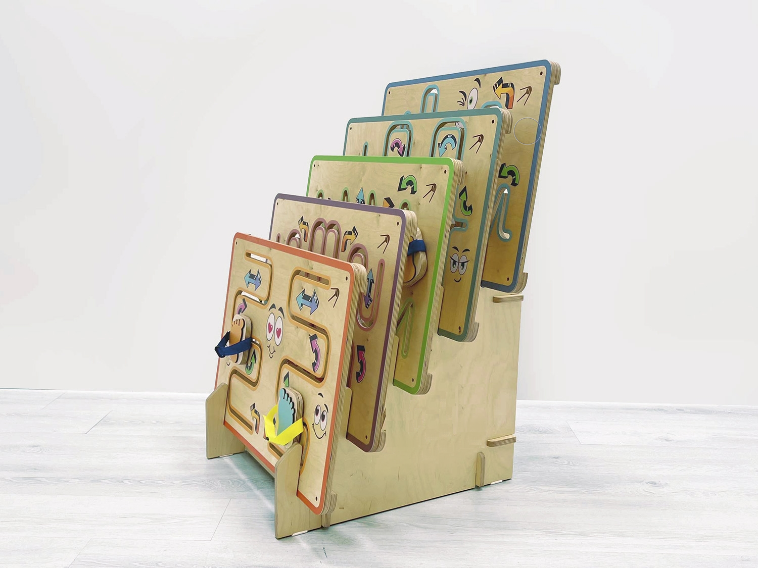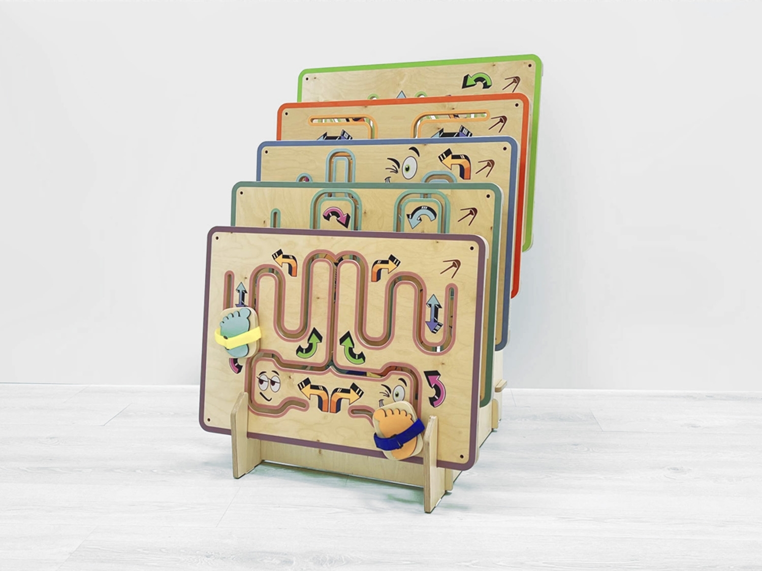 В комплекте идёт пять платформ-лабиринтов и подставка для них. Можно повесить все сразу, если позволяет помещение, можно только одну — и заменять платформы по мере надобности. В методическом пособии собраны варианты занятий, которые можно проводить с детьми.