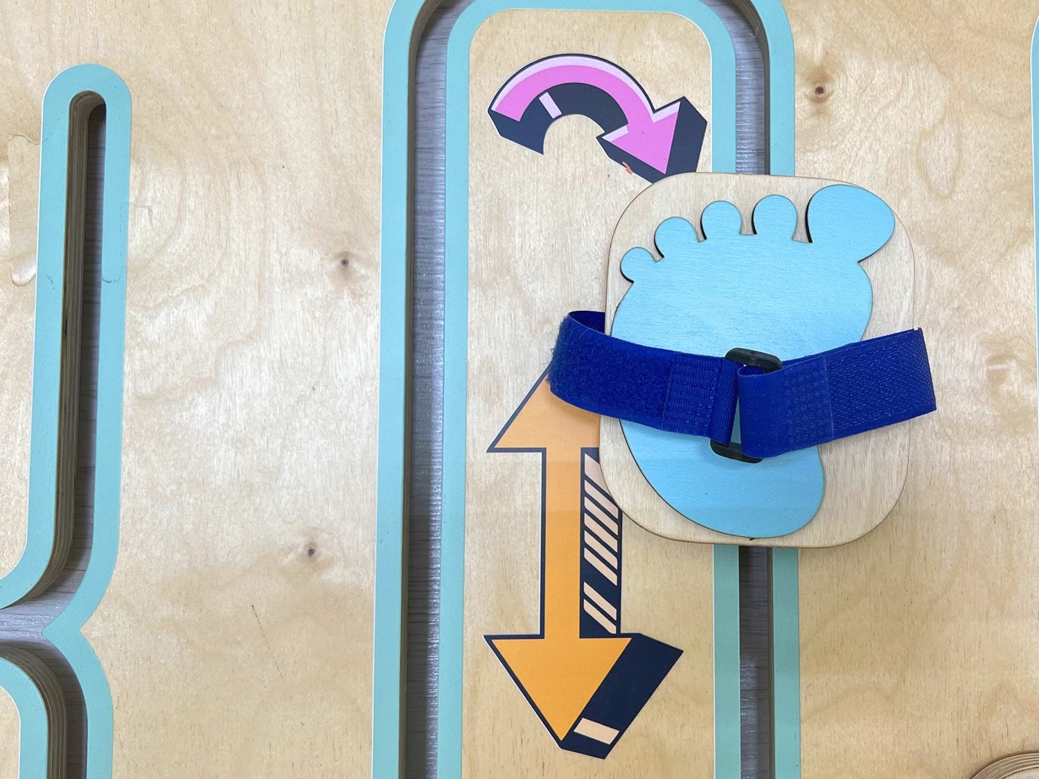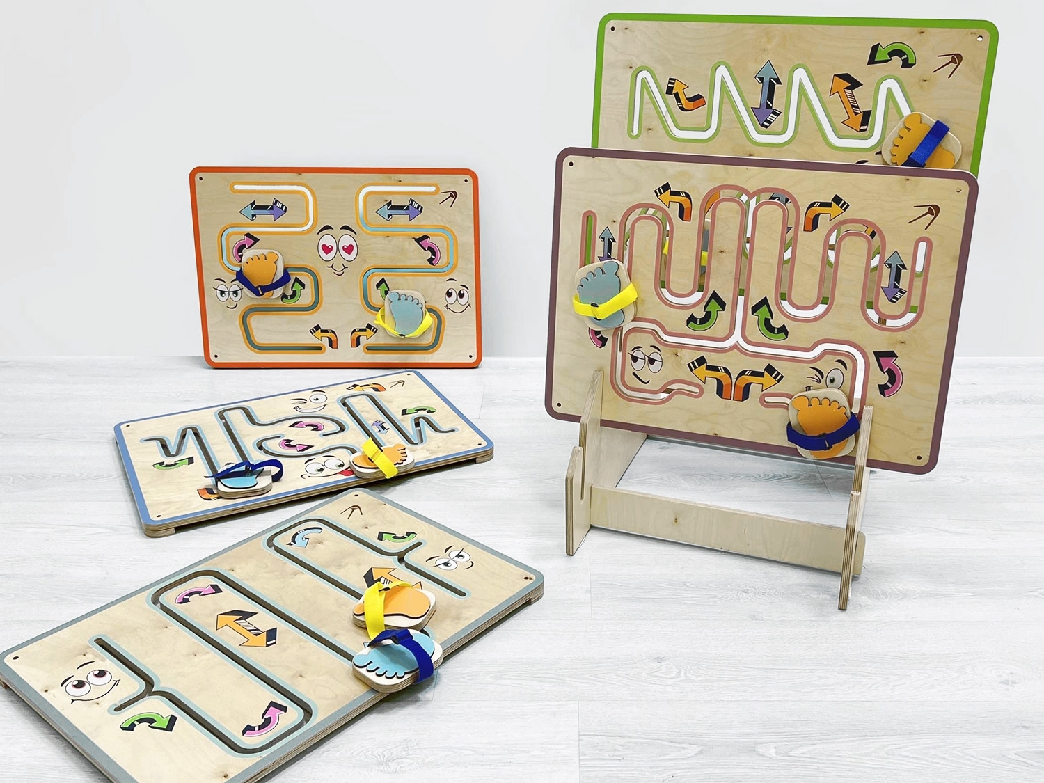 Платформа «Ногоборда» закрепляется на стене, дети садятся на пол, вставляют стопы в специальные крепления на подвижных бегунках и передвигают эти бегунки по лабиринту.