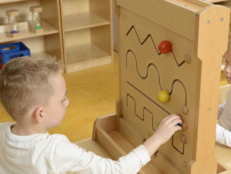 Пособие представляет из себя панель, выполненную из березовой фанеры, на лицевой части которой выполнены 4 прорези-дорожки в виде различных линий (пилообразной, извилистой, прямой и ломаной), в которых подвижно закреплены 4 разноцветных шарика. В начальной точке прорезей имеются заглушки для изъятия шариков. Для усложнения заданий можно перемещать шарики по линиям двумя руками одновременно.