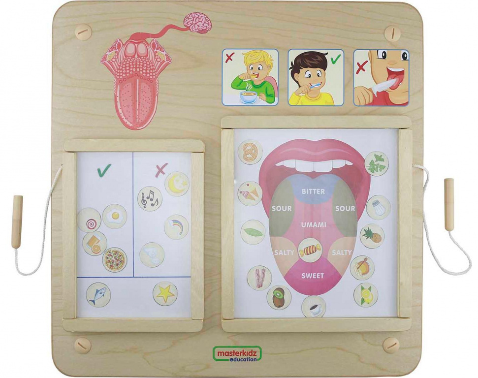 Панель объясняет детям, что с помощью языка мы ощущаем вкус. Есть четыре типа вкуса: соленое, сладкое, кислое и горькое и существуют зоны на языке, ответственные за эти четыре вкуса. Детям смогут поместить магнитные фишки с различными продуктами питания в правильные зоны на языке.