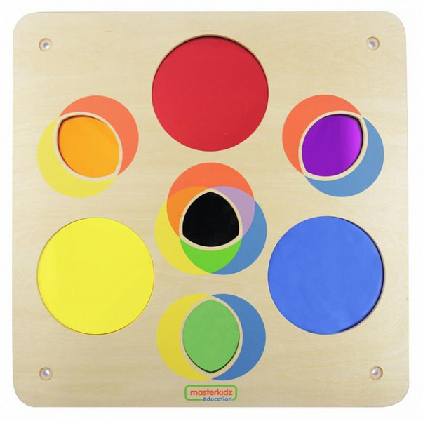 - 3 лепестковых углубления, в которые вмонтирована зеркальная поверхность в 3-х составных цветах: оранжевый, зеленый, фиолетовый. Наглядно представлено, как составной цвет получается при смешивании 2 основных цветов.