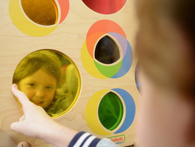 - 3 круглых углубления, в которые вмонтирована зеркальная поверхность в 3-х основных цветах: красный, синий, желтый.
