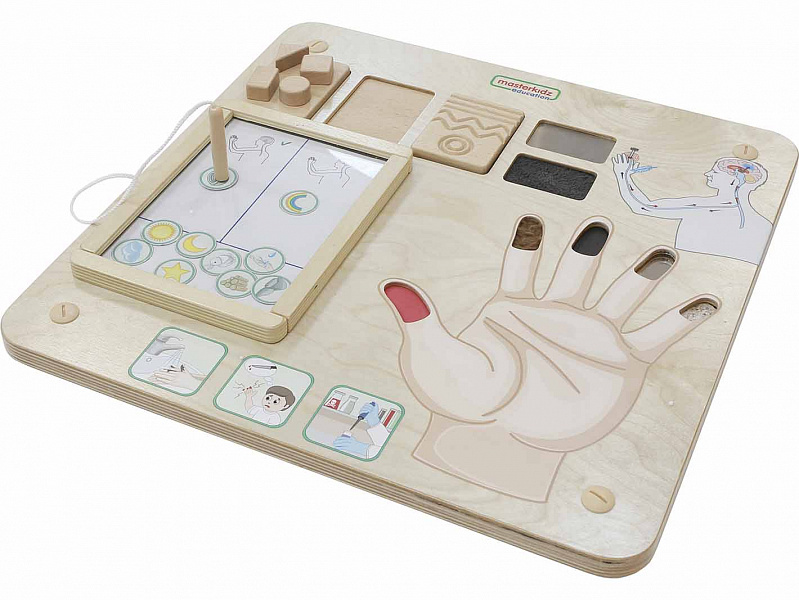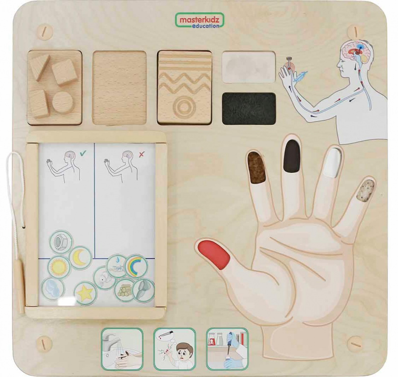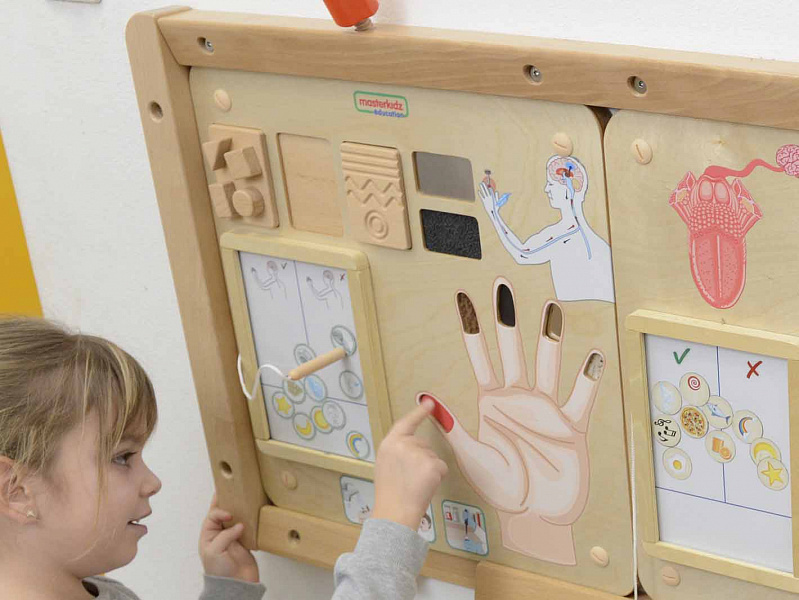 На лицевой части панели с правой стороны изображена кисть руки, на кончиках пальцев которой нанесены различные образцы материалов. Прикасаясь к ним, ребенок понимает, что наша кожа является органом осязания, который мы используем для определения шероховатости, гладкости, твердости, мягкости или различных форм объектов.
