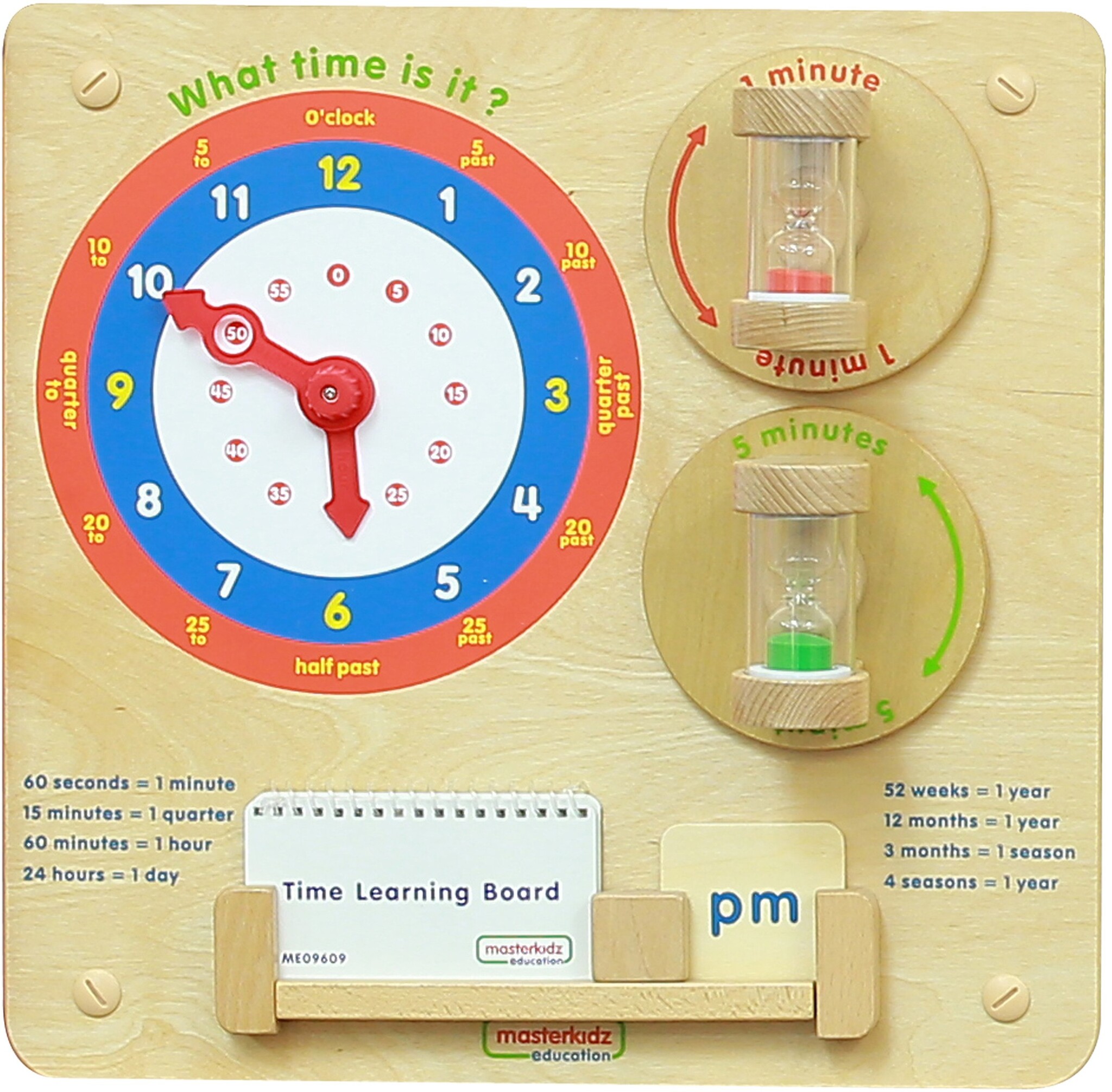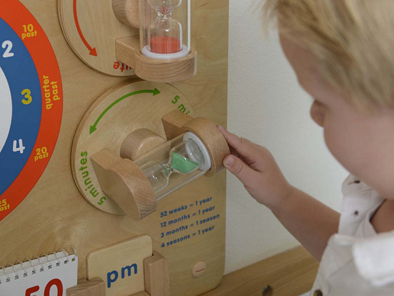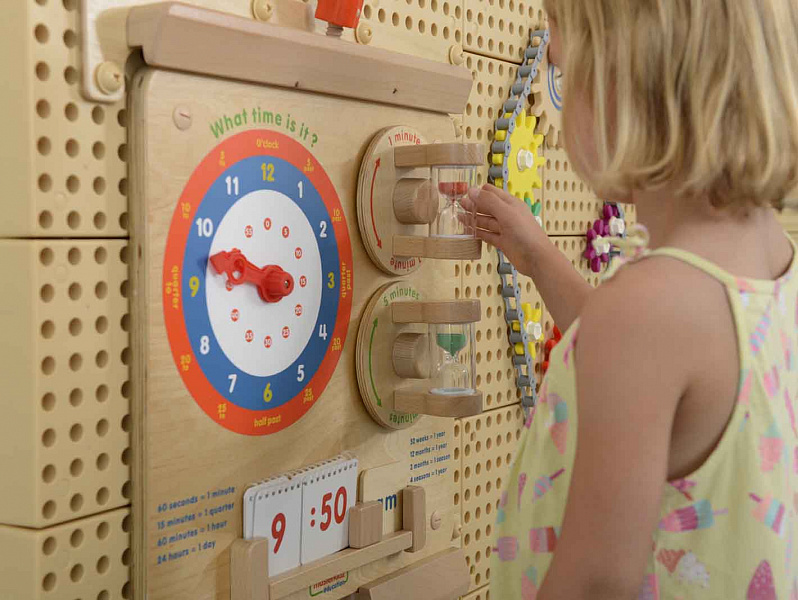 Панель «Время» предназначена для знакомства с таким понятием как время, помогает детям научиться определять время по часам со стрелками и понимать временные интервалы.