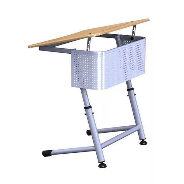 Основа парты - металлокаркас на круглой трубе - две боковые металлические опоры, окрашенный износостойким полимерным покрытием серого цвета с двумя крючками для портфеля, к которым крепится горизонтальная столешница эргономичной или прямоугольной формы формы. Ножки имеют пластиковые заглушки для регулировки неровных поверхностей пола,а так же предотвращения преждевременной порчи напольного покрытия.