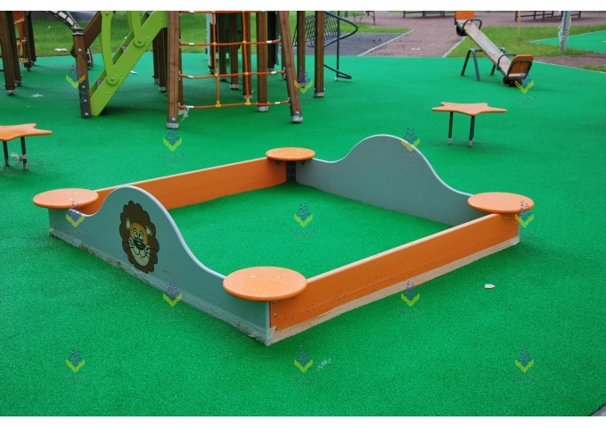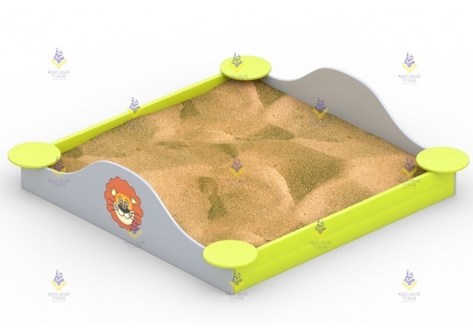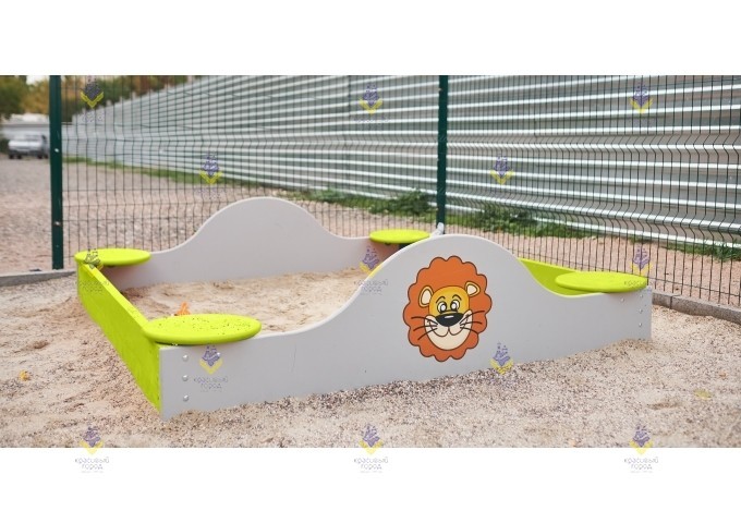 Песочница «Лев» будет красиво смотреться на вашей детской площадке. Это классическая деревянная конструкция, внутрь которой помещается песок. Свое название модель получила благодаря принту с добрым львом Бонифацием, который наносится с двух сторон на боковые части.