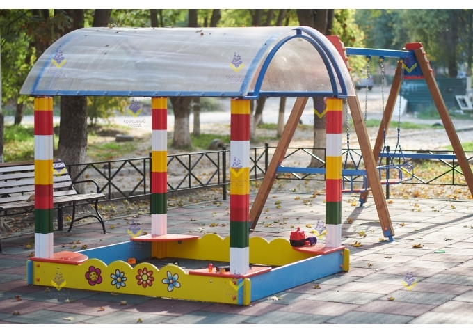 Песочница с навесом сделает игру на детской площадке безопасной и веселой вне зависимости от погоды на улице. В оформлении сочетается множество красивых элементов и цветов. Также предусмотрены стойкие к ультрафиолету цветочные принты с боковой части.