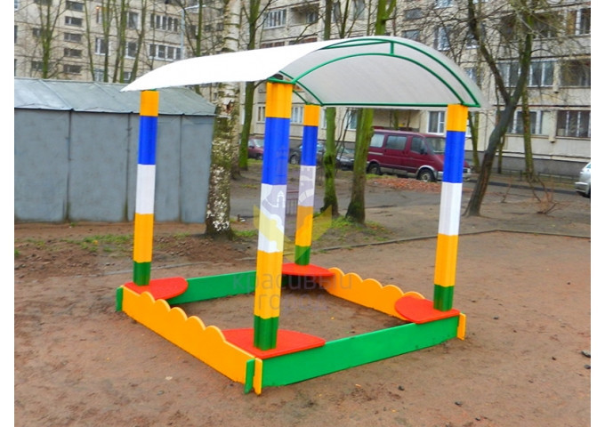 Главное отличие такой модели от стандартной песочницы заключается в наличии специального навеса. Он хорошо защищает песок от намокания, а также дает дополнительное укрытие от палящего солнца. Модель не занимает много места, ее можно быстро разместить на детской площадке.