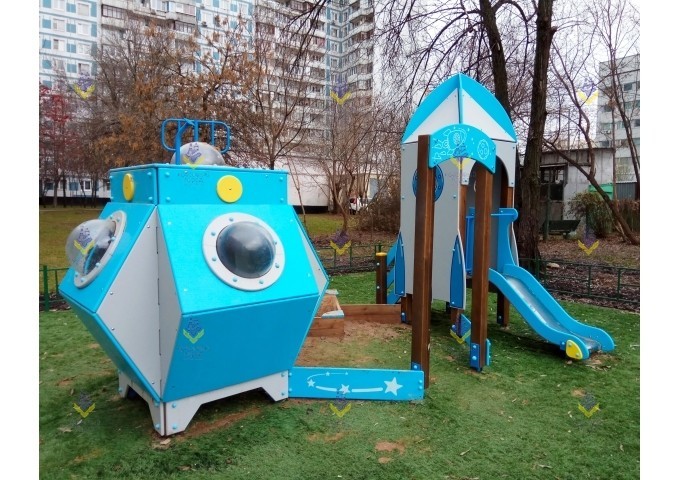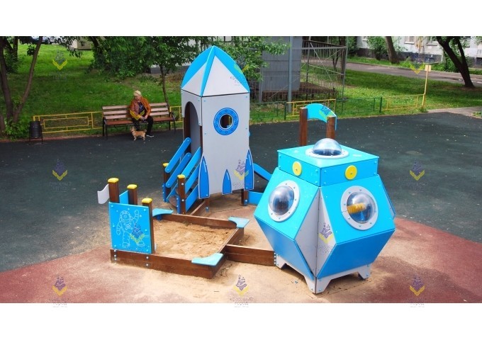 Песочный дворик «На луне» сразу привлекает внимание своим необычным внешним оформлением и конструкцией. Он выполнен в космической тематике, так что все ключевые элементы стилизованы под аппараты для исследования межзвездного пространства.