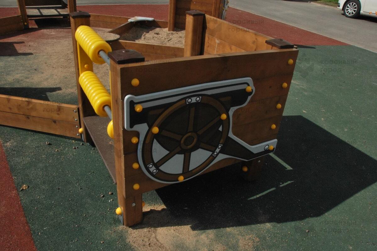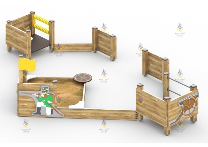 Внутри устанавливается песочница, есть несколько элементов, стилизованных под оборонительные позиции. Также предусмотрены интерактивные элементы – это счеты для развития моторики. При желании, с ними можно выполнять различные упражнения для изучения основ арифметики.